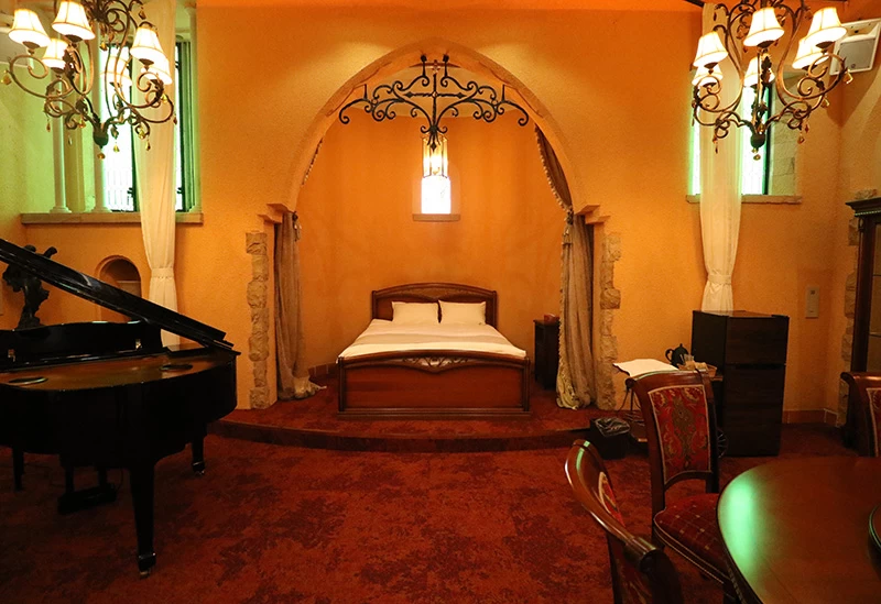 静岡県伊東市の「川奈ステンドグラス美術館」内にある、“泊まれる美術館”として知られるホテル。イタリアンクラシックをテーマにした優雅な空間が広がり、アンティーク家具やシャンデリア、ピアノを備えたリビングでは、海外の洋館に滞在しているような特別なひと時を過ごせます。大人8名でも利用できる貸切プールの先には、青い海とレンガ造りの美術館が広がり、異国のリゾートを思わせるロケーションが魅力。日中はもちろん、幻想的なナイトプールも楽しめます。