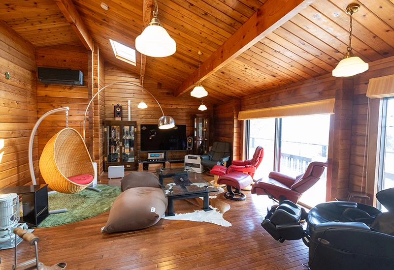 ナラの林に囲まれた静寂に佇む一棟貸し宿。あえてテレビを置かず、木のぬくもりと和のテイストを盛り込み、“禅”をテーマに据えたリビングは、侘び寂び感じる空間。グループでの利用にも便利な間仕切りのない広々したロフトのほか、リラックスできる仕掛けが施された浴室や山の緑が迫りくるデッキテラスなどデトックス効果も抜群です。