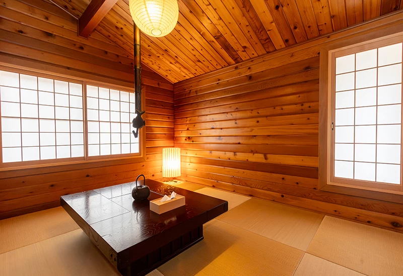 客室は2つ用意されており、南向きの部屋である「火の間」では、太陽の光の移ろいと共に心地よい時間を過ごすことができます。この部屋では、暖かな光が部屋全体を満たし、自然との調和を感じることができます。次に「水の間」は、池のある中庭に面しており、自然の音や風景を楽しみながら、心身をリフレッシュすることができます。