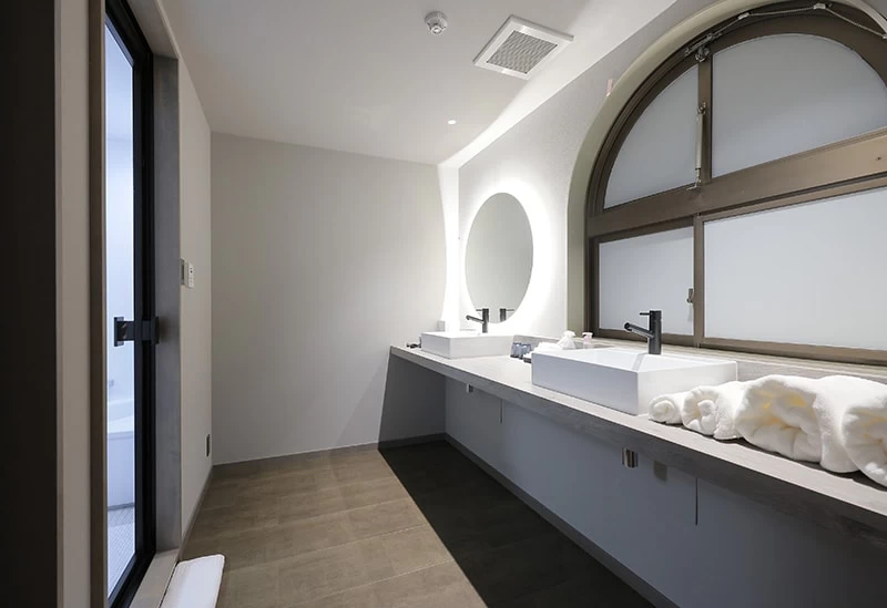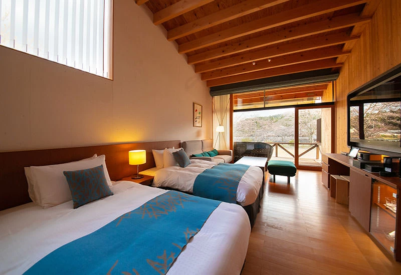“白であるための白い客室”である「ROOM-3つむぎ」は、専用バスルーム付き。クイーンサイズベッドが2台あり、最大8名で宿泊可能です。山々の向こうから昇る朝日を望める「ROOM-2めぶき」は、専用半露天風呂付き。クイーンサイズベッドが2台あり、最大8名で宿泊できます。