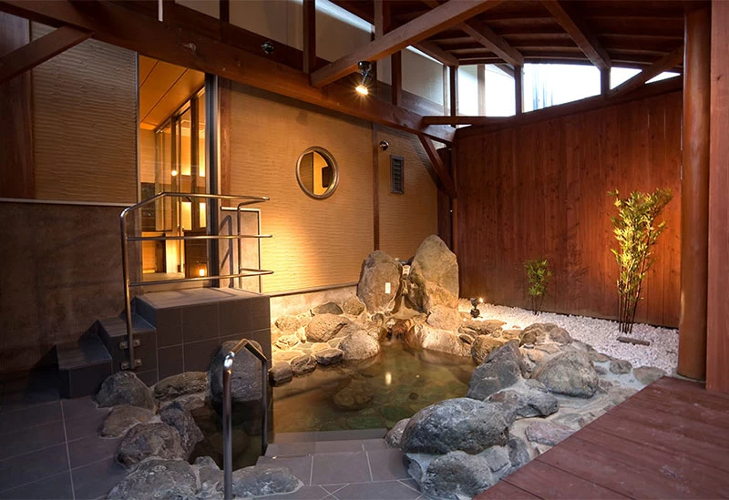 自慢の混浴露天風呂は、日高川の渓谷や四季折々の表情を見せる山々を望みながら湯浴みを堪能できますよ。夜はライトアップされ、昼とは違った雰囲気を楽しめます。その他にも、檜風呂や御座敷風呂などさまざまな湯を用意しています。