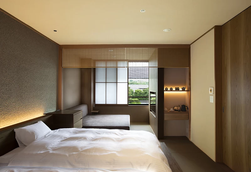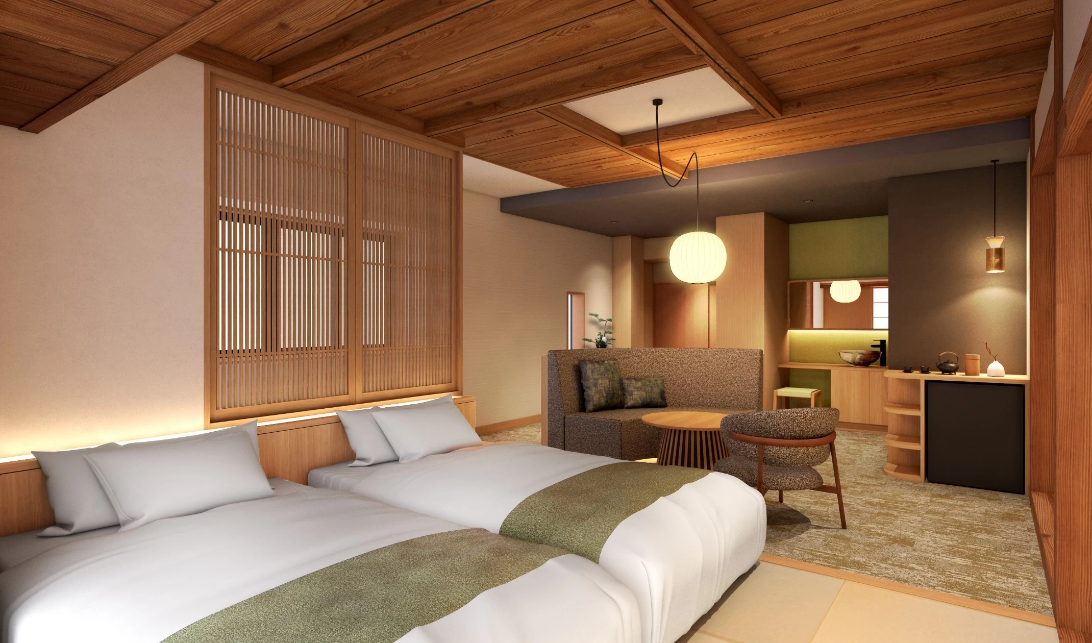 JR京都駅からほど近い「町家ホテル 京都高瀬川別邸」は、京都観光の拠点として最適なロケーションに位置しています。清水寺や祇園など、京都を代表する観光スポットへのアクセスも抜群です。宿泊プランは、ダブルルーム、ツインルーム、トリプルルームと幅広くご用意しており、全室には国産檜をふんだんに使用した総檜風呂が完備されています。和室に調和するように高さを抑えた最高級ランクのシモンズ製ベッドが備えられ、快適な睡眠を提供します。朝食は、ホテルオリジナルの洋朝食と、京都ならではの仕出し和朝食の2種類から選べます。旅の疲れを癒やすために厳選されたアメニティもご用意しており、お客様の快適な滞在をお約束いたします。
