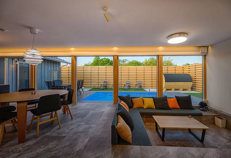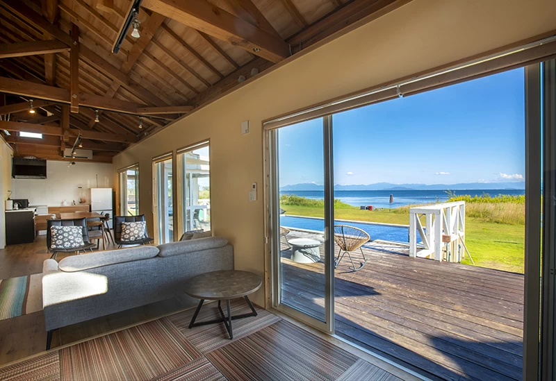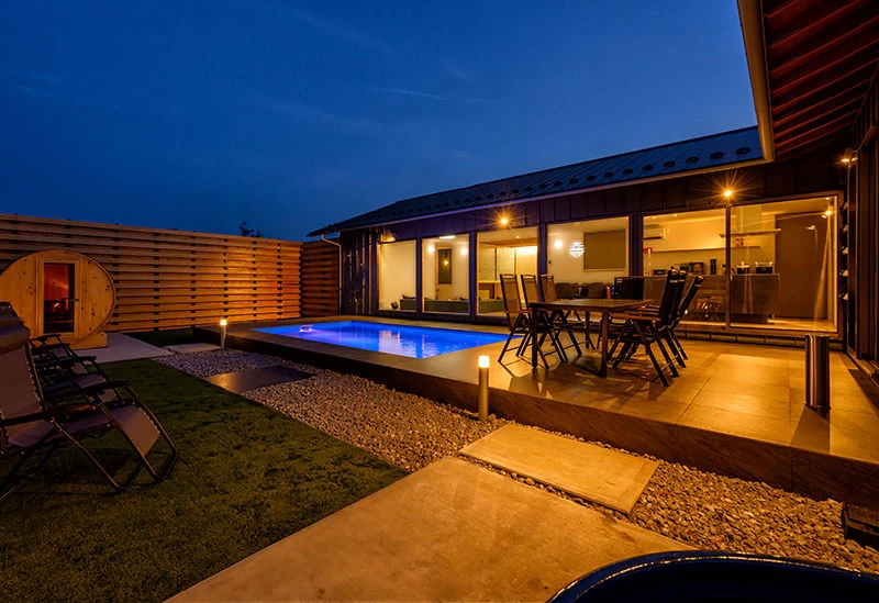 琵琶湖の湖畔に佇む「LAKE villa CHITOSE」は、どこを切り取っても絵になる一棟貸しのヴィラです。天井が高く開放的なリビングからは雄大なレイクビューを一望でき、客室は「湖」「陽」「月」をテーマにした洗練されたデザイン。庭にはリゾート感溢れるプライベートプールやバレルサウナ、信楽焼の露天風呂を完備しています。夜はライトアップされた幻想的なプールサイドで、愛犬や大切な仲間とフォトジェニックなひと時を過ごしてみてはいかがでしょうか。