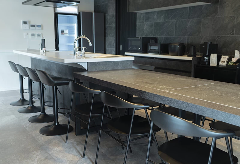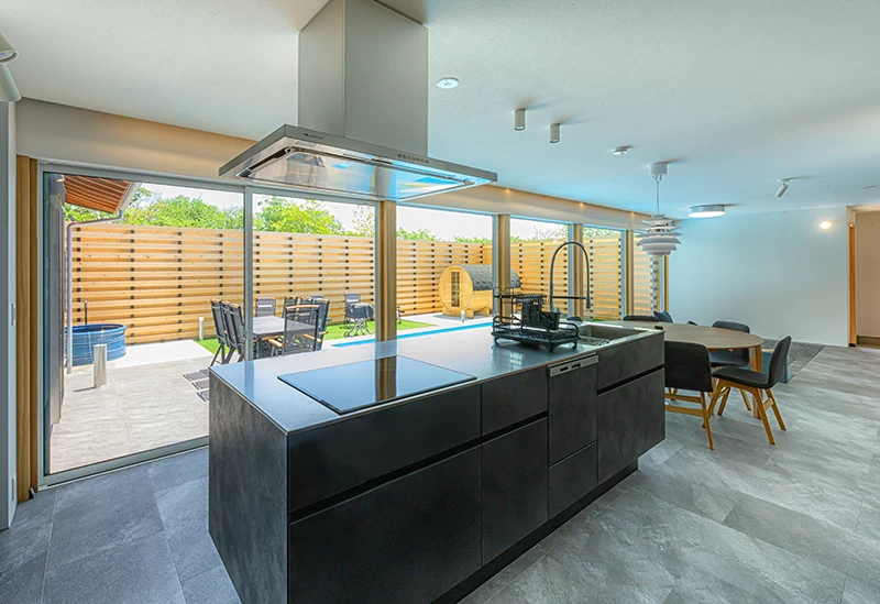 滋賀県高島市、琵琶湖のほとりに2025年7月1日オープンしたプライベートヴィラ「HITOSE」。木の香りに包まれる円筒型バレルサウナや信楽焼の水風呂、イルミネーションが幻想的なプライベートプールなど、心からリラックスできる設備が揃います。黒を基調としたスタイリッシュなアイランドキッチンには各種調味料や調理器具、冷蔵庫が備えられ、好きな食材を持ち込んで料理を楽しむことも可能。光あふれる空間で、特別な時間をお過ごしください。