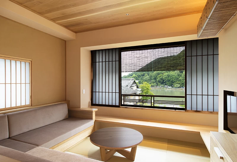 客室には旧暦の月の名前が付けられており、室内には竹を使った調度品が多く使われていて、優雅でおしゃれな雰囲気が漂います。さらに、各部屋をイメージした色で染められた「夢こうろ染」は、太陽の光によって色が変化し、癒やしの空間を作り出します。