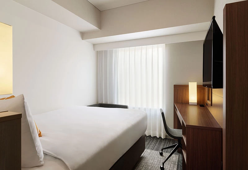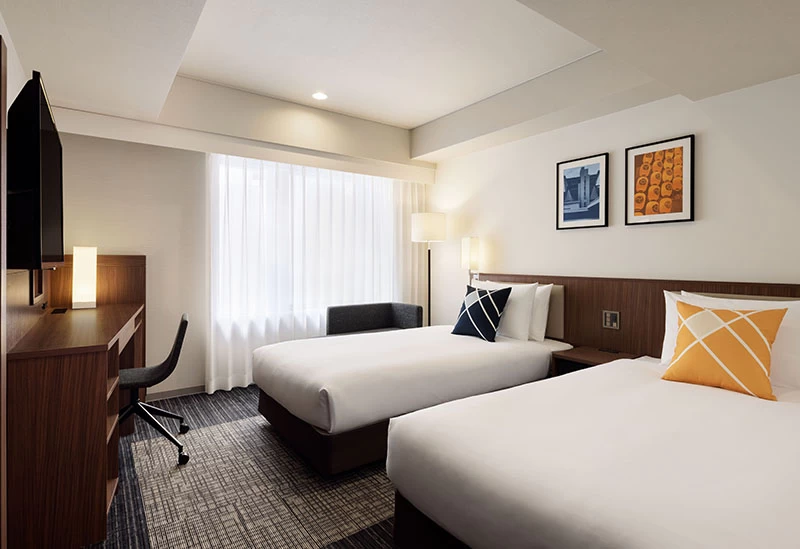マリオットグループの新ブランドとして2024年にオープンした「フォーポイントバイシェラトン京都烏丸御池」。地下鉄烏丸御池駅に近い立地で、観光にもビジネスにも便利です。ロビーは幾何学模様やコンパスのアートに京都らしいデザインを融合し、地域性とモダンさが調和した空間に。客室は約14平米のシングルやダブル、約19平米のツイン、車椅子対応のアクセシブルツインまで多彩にそろい、滞在スタイルに合わせた選択が可能です。ベッドにはシモンズ社製やドリームベッド社製の「サータ」を導入し、上質な眠りをサポート。さらに、無料Wi-Fiや加湿機能付き空気清浄機に加え、コインランドリーや自動販売機など充実した館内設備も備え、長期滞在にも安心です。