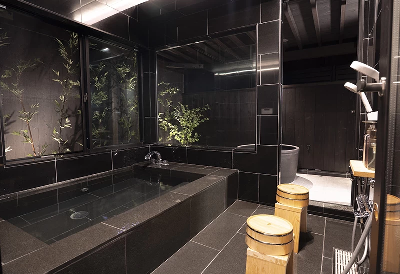 贅沢な空間づくりと路地に見立てた共用廊下、そしてお部屋に新しく設えた浴空間が特徴の宿泊施設。日常の喧騒を忘れ、贅沢な「湯」体験を心ゆくまでご堪能いただけます。ご家族やご友人と一緒に、リラックスした時間をお過ごしいただける、魅力あふれる宿です。入口の暖簾をくぐり、客室に向かうまでの路地が京都でのスペシャルな宿泊体験を予感させます。桜、竹、梅、楓と4つのコンセプトのお部屋には、それぞれ特徴的な「湯」体験ができる浴空間を新たに設けました。内風呂や露天風呂など、お部屋によって異なる体験をお楽しみいただけます。各客室の定員は5名で、お子様連れのご家族も安心してご利用いただけるよう、0歳から5歳のお子様は添い寝が可能です。またお部屋には、キッチンと洗濯乾燥機が完備されており、長期の滞在でも安心してお過ごしいただけます。