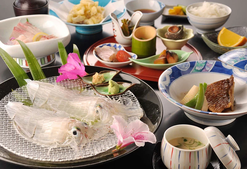 高台から玄界灘を一望できる宿のおすすめポイントは、なんといっても料理。呼子名物の「イカの活き造り」や、「唐津Qサバ」、「佐賀牛」などを味わえるプランが用意されています。朝食は地元食材をふんだんに使用したメニューが並び、事前申し込みをすれば、夕食に子ども向けの料理を提供してもらうことも可能。ペット連れ専用客室などのサービスも充実しています。