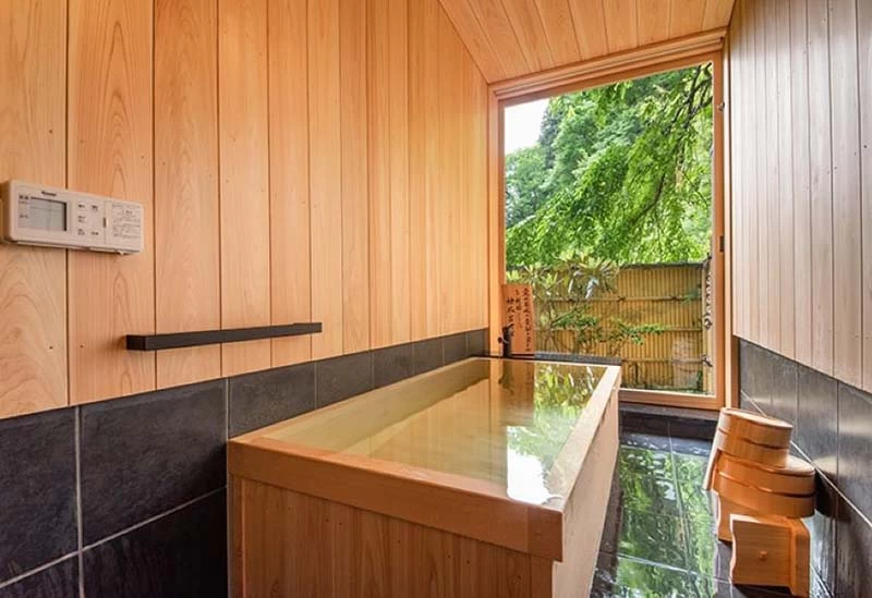 源泉かけ流しの檜風呂で心ゆくまで癒やされる