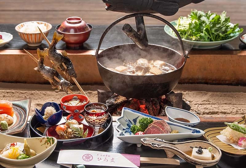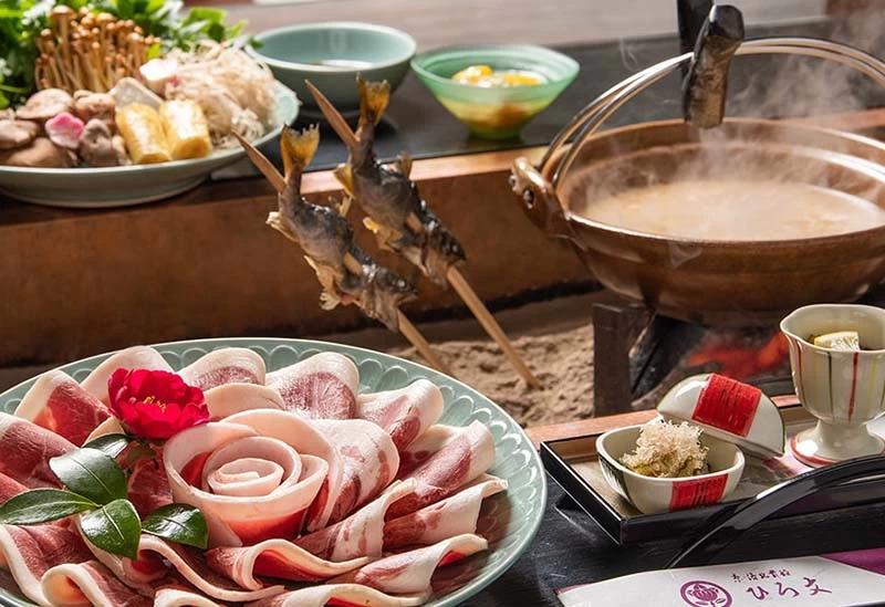 市街地から少し離れたところに、ゆっくりと滞在できると定評のある湯宿です。広大な温泉には檜風呂や石風呂、薬湯風呂、貸切風呂などさまざまなお風呂が用意されており、飽きることなく湯あみが楽しめます。「松園荘 保津川亭」を訪れたらぜひ味わいたいのが鍋料理。中でもぼたん鍋は猪肉特有のクセが少なく、体の芯から温まると人気です。