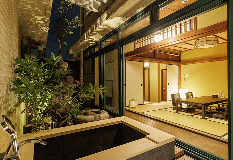 歴史的都市区の中心に佇む「京都の町のど真ん中、お風呂とお料理の宿 旅館こうろ」は、繁華街も徒歩圏内にありながら、静かな環境で京都の魅力を存分に味わえます。天然の素材にこだわった大浴場は、御影石や青石、竹などが使われ、京都でもめずらしい迫力ある総木造りの浴槽があります。また、ひのき風呂付の特別室も用意。プライベートな空間でゆっくり寛ぐことができ、新婚の夫婦にもおすすめです。料理もまた一流で、素材を活かした京料理が自慢です。