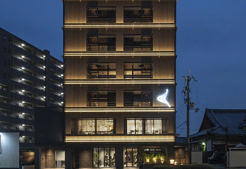 伝統的な街並みや老舗が軒を連ね、観光と生活が結びつく京都の中心地区「歴史的都市区」の中心に位置する旅館。コンクリート打ちっぱなしの瓦屋根や、意匠を凝らした窓格子といった伝統とモダンが融合したおしゃれな外観が目を引きます。