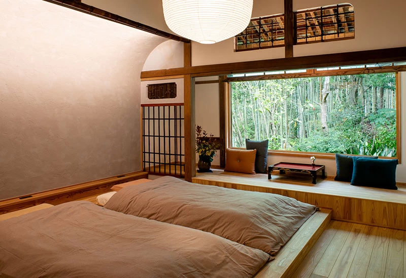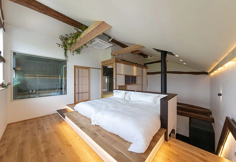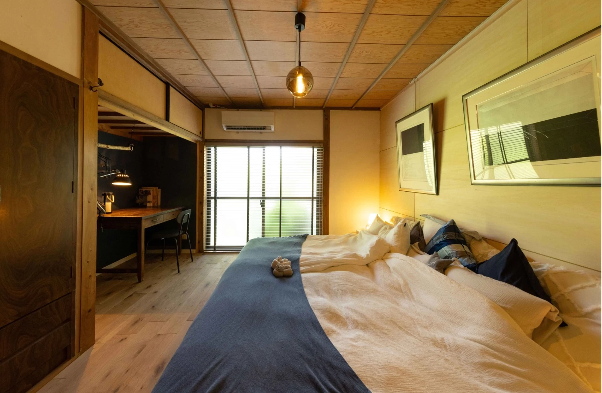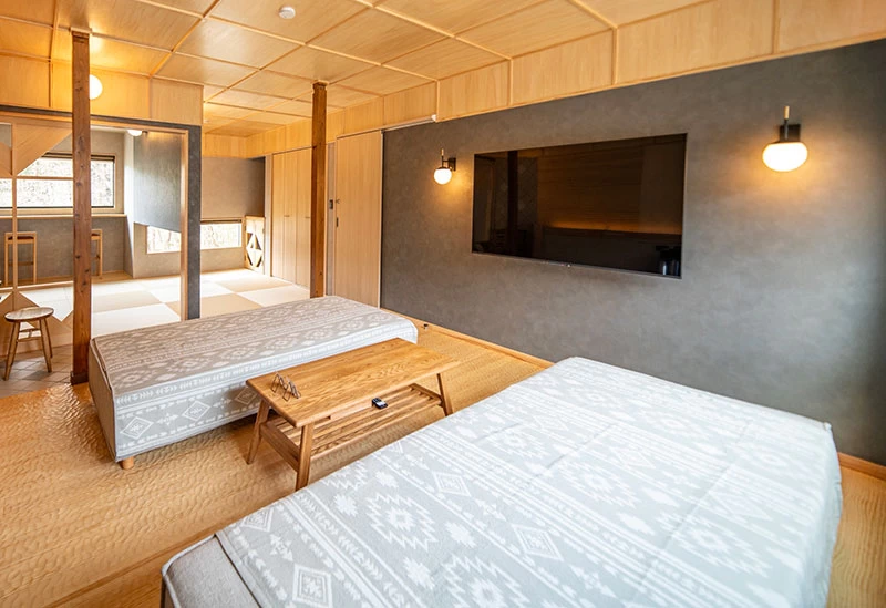 福岡県南部のみやま市にある「山の家」は、築約100年の古民家をリノベーションした一日一組限定の一棟貸し宿です。線香花火メーカー「筒井時正玩具花火製造所」が運営しており、縁側で手作りの線香花火を灯す、ここならではの体験ができます。夕食はリクエスト制で、ジビエイタリアン、薬膳鍋、近隣のそば店でいただくそば懐石から選べるのも嬉しいポイント。自家製のびわを使った化粧水やびわの葉で染めた部屋着など、地域の文化や自然の恵みを取り入れたおもてなしで、心身ともに癒やされる大人の滞在が叶います。
