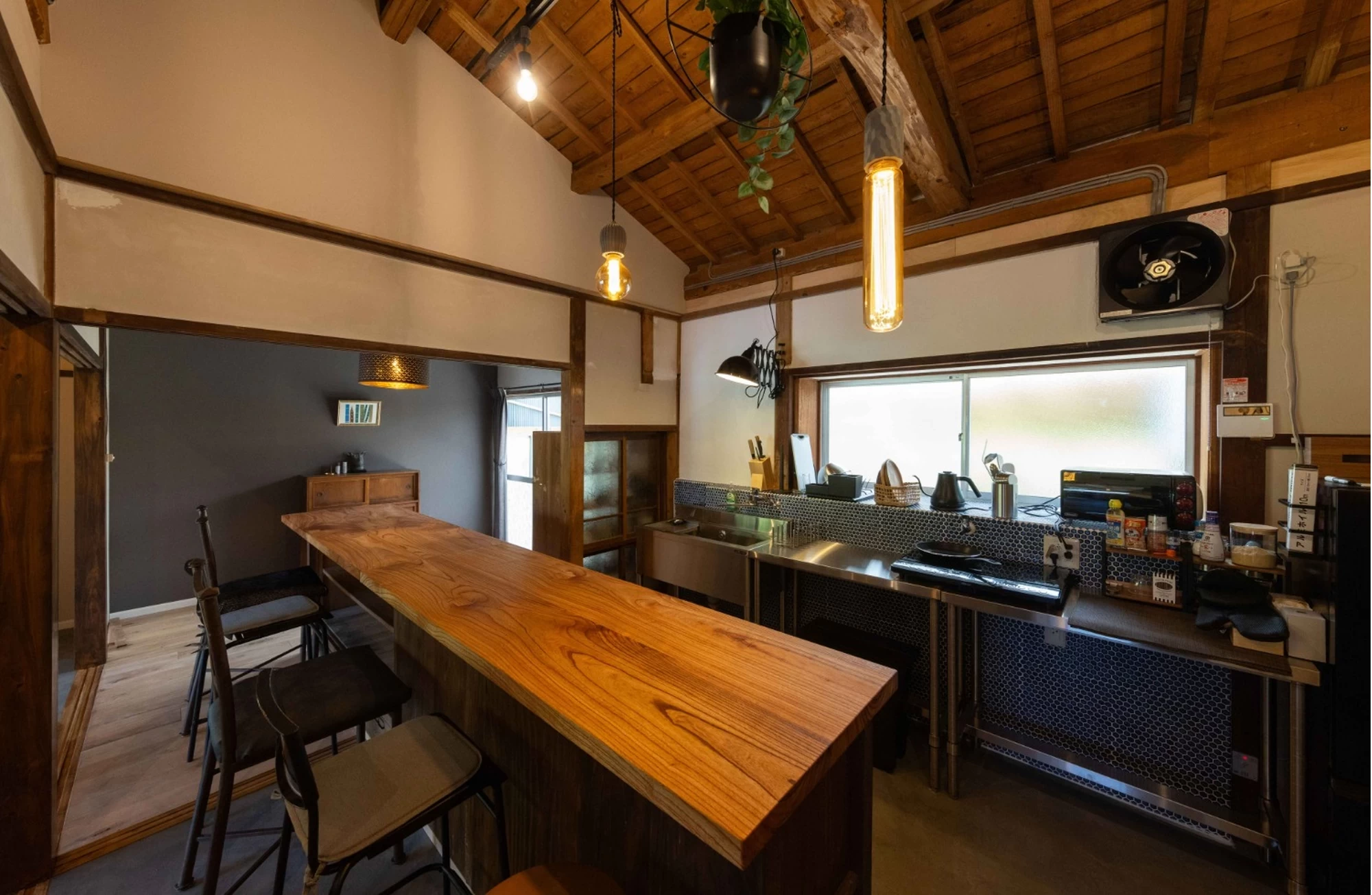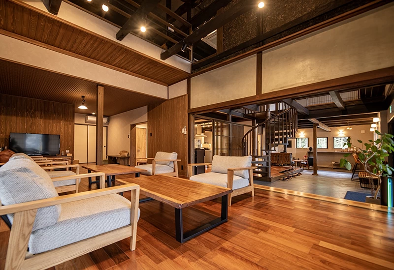 2022年春に大分県日田市に誕生した古民家の宿。築140年以上の建物をリノベーションした一棟貸し宿です。約300坪の広大な敷地には、懐かしさとモダンな雰囲気を兼ね備えた母屋とカフェを営業している蔵造りの建物があり、滞在中はそのすべてが貸切で利用できます。多人数で宿泊できるため、仲間とウッドデッキでバーベキューやたき火を楽しんだり、コワーキングスペースでのワーケーションに利用したりと、過ごし方は自在。思い思いのスタイルで古民家ステイを楽しみましょう。