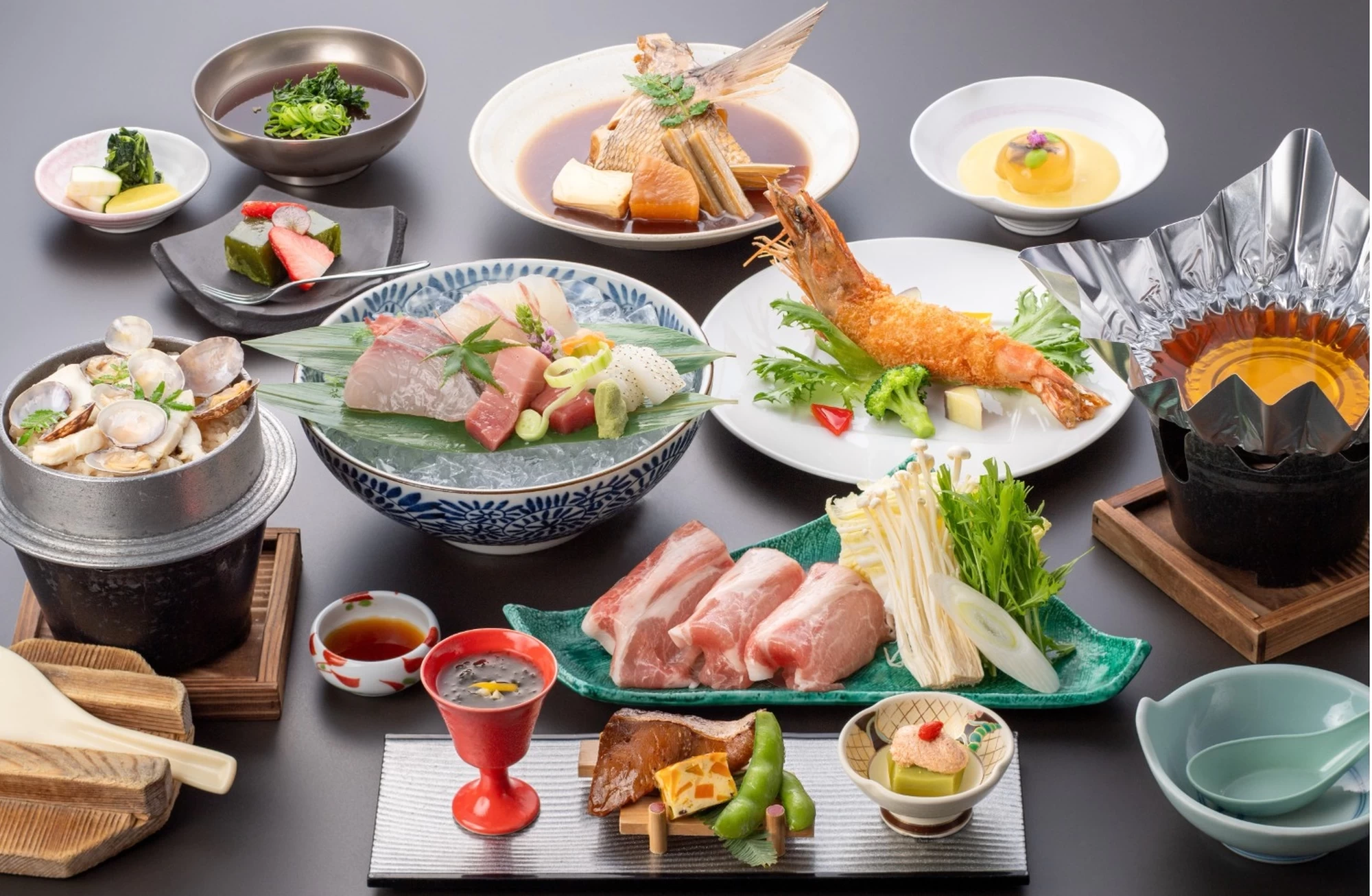 太平洋の絶景を望む客室が自慢の「浜の雅亭 一井」。部屋からは水平線や移ろう海景色を眺めることができます。夕食は松阪牛や伊勢海老、アワビなど、伊勢志摩の高級食材を贅沢に盛り込んだ会席料理をいただけます。素材の持ち味を丁寧に引き立てた彩り豊かな一皿は、盛り付けや香りまで季節の魅力が満載です。温泉は名高い「榊原温泉」を使用しており、なめらかな湯ざわりが心地よいひとときを演出します。夏は小さなお子様向けの屋外プールも楽しめ、ご家族での滞在にもおすすめです。伊勢志摩の豊かな恵みに癒やされる旅を楽しみましょう。