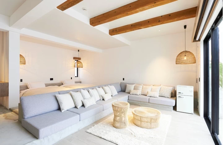 宮古空港から車で約15分、全室にプライベートプールを備えたラグジュアリーなヴィラ「Grand Bleu Gamin」。1日5組限定だからこそ叶う静かで贅沢な時間を堪能できます。開放感あふれるフラットタイプの客室は居心地の良さを徹底敵に追求しています。館内には宮古島食材を活かしたフレンチレストランやスパもあり、宿泊者はもちろんビジター利用も可能です。満天の星に包まれ、島時間に身を委ねる極上の癒やしを体感できます。