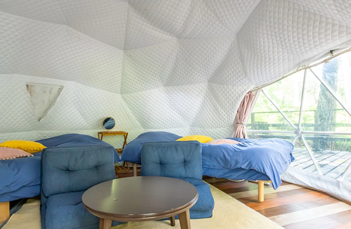 敷地内には7棟のドーム型テントからなるグランピング施設があり、非日常空間にお子さんも大興奮間違いなし! 冷暖房完備で快適に過ごせますよ。