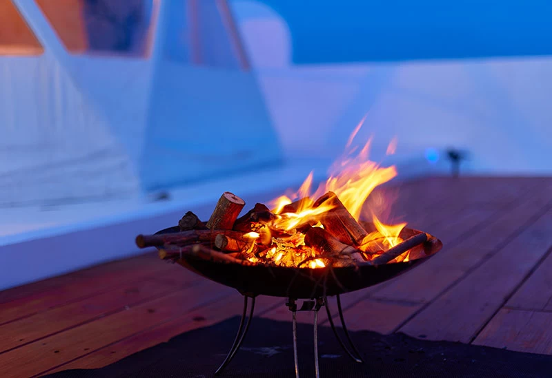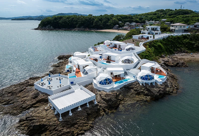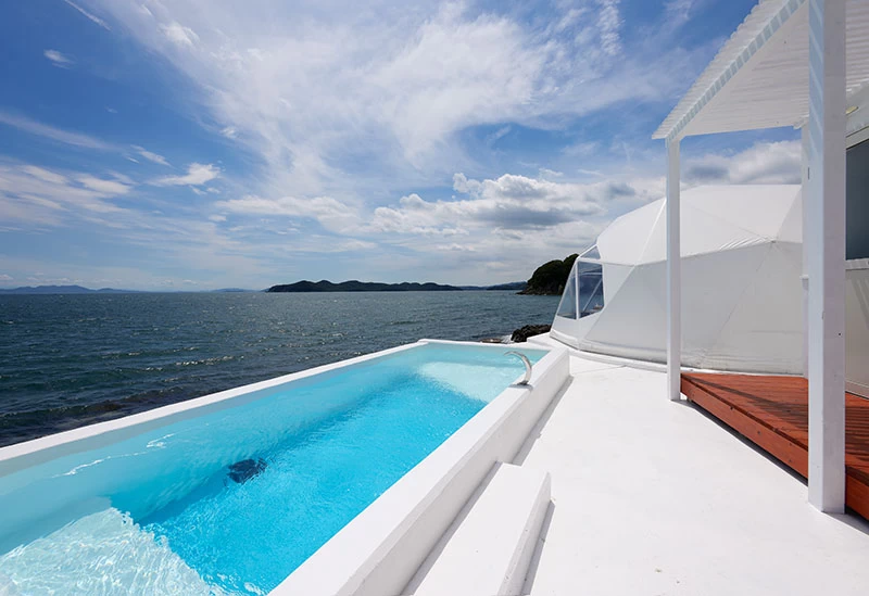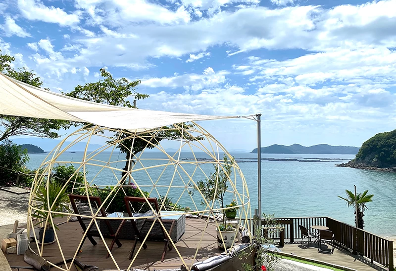 山陽自動車道備前ICから約16分、ギリシャのサントリーニ島をイメージしたグランピング施設です。プライベートプールが付いたドームテントは2〜5人で利用可能。冷暖房、Wi-Fi、トイレなど快適に過ごすための設備が充実しており、グランピング初心者も気軽に利用できるのがポイントです。ディナーでは「日生牡蠣」をはじめとした日生町産の新鮮な海鮮を楽しめます。島で採れたみかんの搾りたてジュースやホットサンドが味わえるモーニングも人気。底引き網漁体験やみかん狩りなど、季節ごとのアクティビティも豊富です。