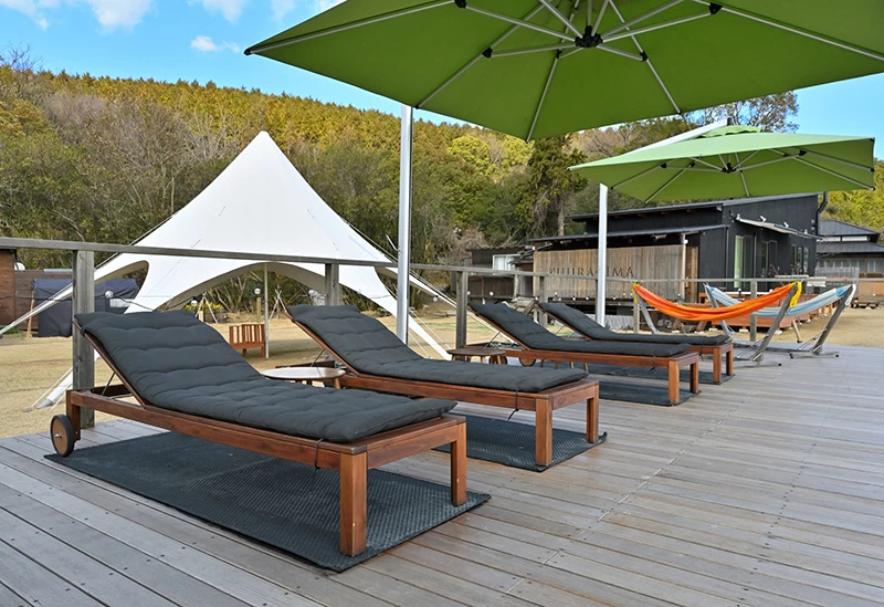 瀬戸中央自動車道水島ICから約35分、グランピング型のリゾート施設です。「チルデッキ」やプール、バレルサウナなどの施設が揃い、特別感あるリゾートタイムを楽しめます。客室では瀬戸内海の絶景を眺められ、「アウトドアリビング」ではグリルメニューや地元食材のコース料理などの岡山グルメも味わえます。「ファイヤーデッキ」では、キャンプファイアを毎日開催。団体旅行や家族、友達同士と遊びに行くのにもぴったりのリゾート施設です。