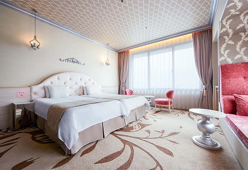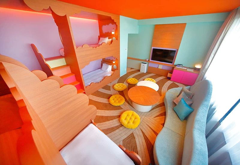 2018年夏、「ユニバーサル・スタジオ・ジャパン」のオフィシャルホテルとして誕生した「ホテル ユニバーサル ポート ヴィータ」。“太陽や自然の恩恵を大いに受けた活気あふれる場所”をコンセプトに、ポップでキュートな客室や、パークを一望できる客室、メゾネットルームなど、全14タイプの多彩なゲストルームを用意しています。なかでも人気の「きらきらコーナールーム」は、ピンクやシルバーを基調にした約44平米の空間。女性の憧れが詰まった、女子会にもぴったりの“映える”一室です。全室バス・トイレはセパレートタイプで、複数人での宿泊も快適に過ごせます。