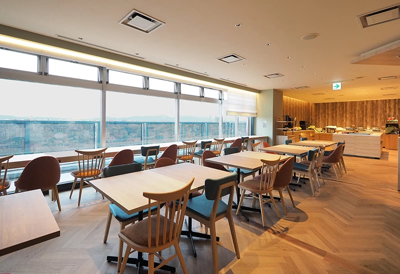 9階にある朝食レストラン「スカイラウンジ Raku」では、バランスと健康に配慮したメニューで、一日の始まりにエネルギーをチャージ。料理長こだわりの朝食ビュッフェには、地元食材を使った和洋さまざまな料理が並び、朝のひと時を豊かに彩ります。いつもより少し特別な朝を、ホテルで迎えてみてはいかがでしょうか。