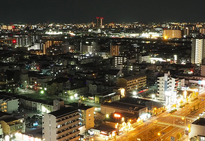 高層階からの眺望が魅力の「日和ホテル大阪住之江公園駅前」。10~19階に位置する客室からは、大阪ベイエリアやシティエリアの美しい夜景を一望できます。館内には、大阪をモチーフにした遊び心あふれるウォールアートが飾られ、フォトスポットとしても人気です。