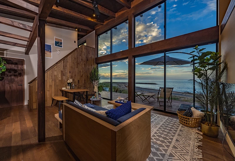 リビングやプライベートデッキから海を一望できる一棟貸しコテージ