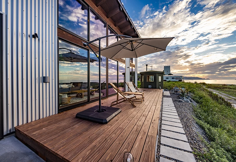 オープンデッキで出雲の夕陽を眺めながら優雅なひと時を過ごす