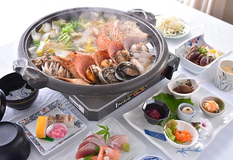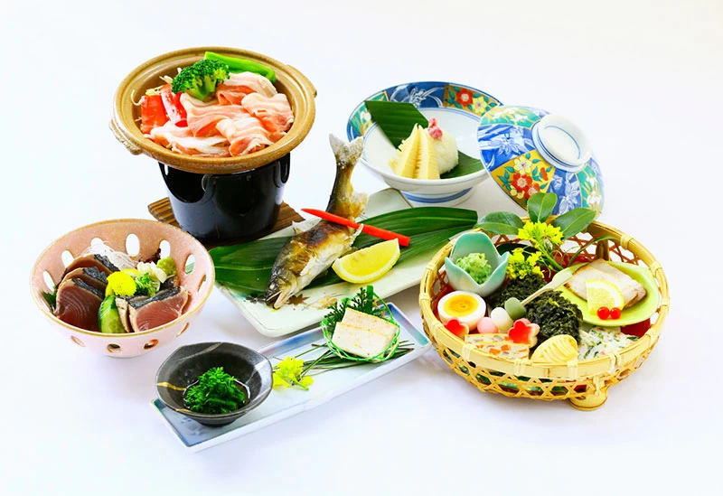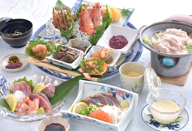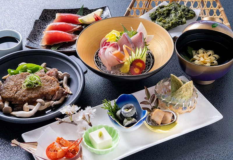 四国最南端に位置する足摺温泉は、約1200年前に湧き出たといわれる温泉地。そんな由緒ある天然温泉が楽しめる「足摺(あしずり)サニーサイドホテル」は、展望台、客室、露天風呂から“黒潮ライン”や太平洋が眺められるオーシャンビューが魅力です。ホテル自慢の料理は、厳選して仕入れた旬の幸が満載の高知の郷土料理「皿鉢(さわち/さはち)料理」。大皿にさまざまな料理を盛り合わせた豪快で華やかな宴会料理です。また、伊勢海老や土佐の旬の野菜、高知ブランド牛「土佐黒毛牛」や高知ブランド地鶏「土佐はちきん地鶏」を使用した陶板焼き会席などが用意されています。太平洋と黒潮を眼下に、郷土料理と温泉を堪能しましょう。