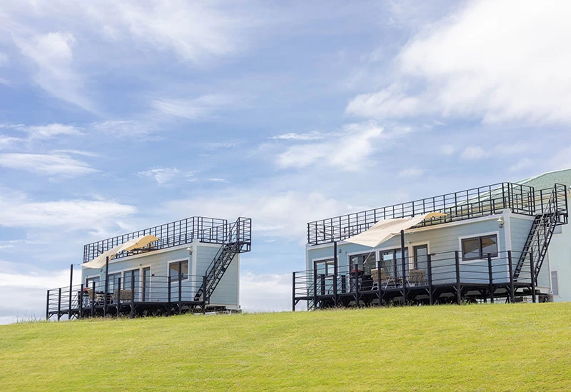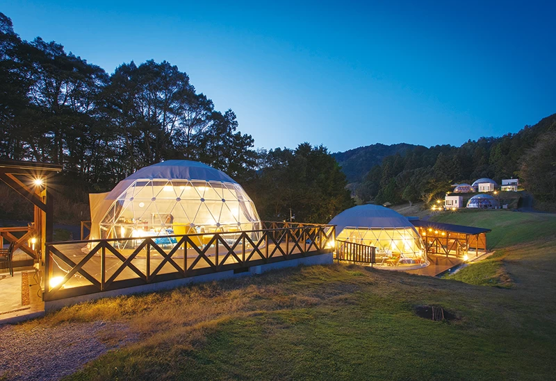 「スカイヒルゴルフクラブ」に隣接するグランピング施設「スカイヒルグランピング~四万十の星空~」では、バスルーム、トイレ、洗面台、バーベキュースペースを備えたドーム型テントや、プライベートプール付きの大型ドームテントを完備。また、キャンピングトレーラー、オートキャンプサイトなども用意しています。夕食は、地元ブランド米「仁井田米」や「四万十ポーク」「四万十鶏」、国産和牛ロース、新鮮な野菜など、四万十産の食材をふんだんに使ったバーベキュー「四万十の星空コース」が人気。朝食は隣接するスカイヒルゴルフクラブのレストランで、四万十の自然とゴルフ場の景観を楽しみながら味わえるモーニングプレートを提供しています。