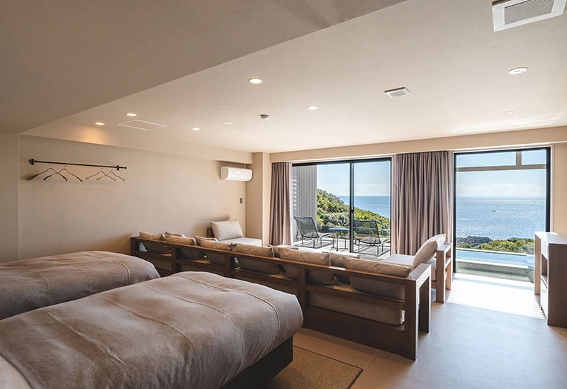 透明度の高いエメラルドグリーンの海で知られる柏島にある「柏島ヴィレッジ」。水揚げされる魚の新鮮さにも定評があり、四季を通して旬の鮮魚が揃いますが、宿の看板商品は柏島産の本マグロ。丸ごと1本を買い付けた本マグロを店舗で解体し、新鮮な生本マグロや生のまま熟成させた逸品をランチやディナーで提供しています。夕食はおすすめ地魚の「海鮮丼」や前菜にご飯と味噌汁が付いた「本マグロざんまいコース」など、5コースを用意。客室は全室ドミトリータイプで、1人部屋から4人・6人用の相部屋を完備。おひとりさまはもちろん、ご家族やグループでカジュアルに利用できます。美しい海でダイビングやシュノーケリングなど、多彩なマリンレジャーを楽しみましょう。