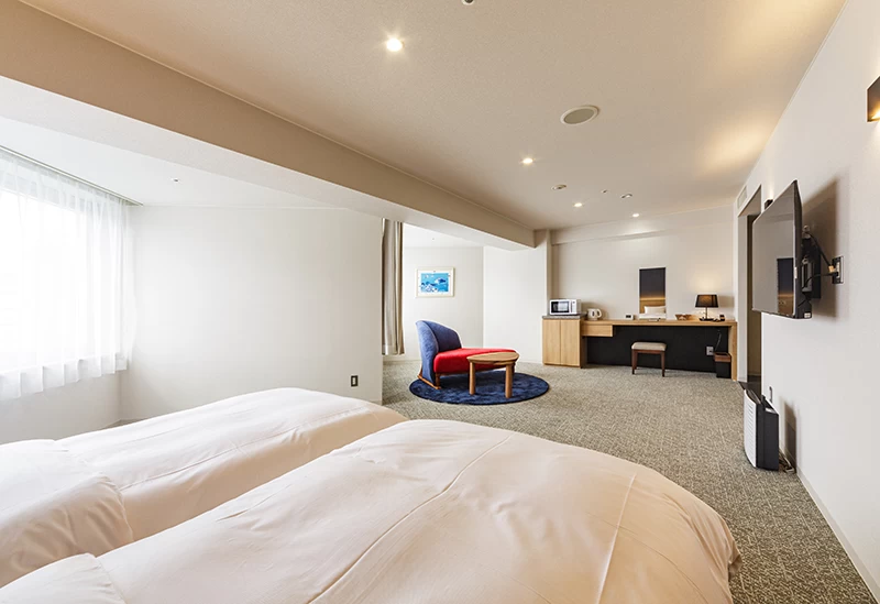 JR徳島駅から徒歩約1分の好立地に位置する「ダイワロイネットホテル徳島駅前」は、観光にもビジネスにも最適なホテルです。全客室はぬくもりとモダンが調和し、スーツケースを置いてもゆとりあるスペースが確保されています。また、デスクワークに適した環境も整っており、快適な滞在を約束します。