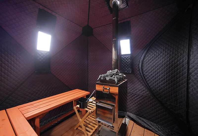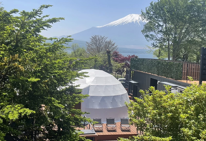 「Private Grandtel AREA407」は、富士山と山中湖を一望できる贅沢な貸切コテージです。エアコン、空気清浄機、Wi-Fi機能搭載プロジェクターなどが備わるドームテントや、シンプルながら快適なシングルベッド2台が配置されたベッドルームコンテナなどがあり、すべてを貸切で利用できます。中でもスパコンテナでは2名用の電気サウナが備わり、ロウリュも可能で、リラックスしたひと時をお過しいただけます。