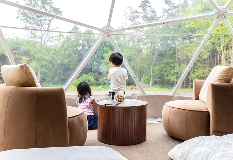 山梨県北杜市にある、1日3組限定のグランピング施設「Glamping My Dear,」。小さなお子さまや愛犬とも快適に過ごせる環境が整っており、各棟には専用のダイニングスペースやバス・トイレを完備。アウトドア初心者にも優しく、安心して滞在を楽しめます。