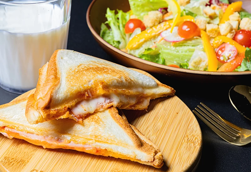 地元産の旬の食材を使った食事は、各棟のウッドデッキスペースで楽しむことができます。また、追加料金を支払えば食材の持ち込みも可能です。朝食には、季節ごとに替わるホットサンドが提供され、美味しい食事で一日を始めることができます。