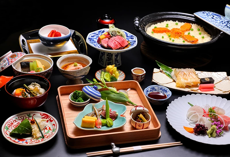 館内のレストラン「Restaurant RIKU-凛久-」では、山梨県産の旬食材を中心に全国各地から選び抜かれた素材を用いた伝統和食を提供。茶室での文化体験やライブキッチン、回転寿司設備など、食を楽しむ多彩な仕掛けも魅力です。