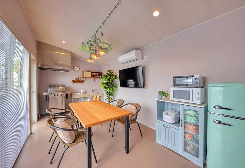 テラスではバーベキューを楽しむことができます。また、食事付きのプランや、機材のみ貸し出しのプランなど用途にあわせたプランを選択することができます。なお、バーベキュー設備には限りがあるため、利用される方は必ず予約をしておきましょう。