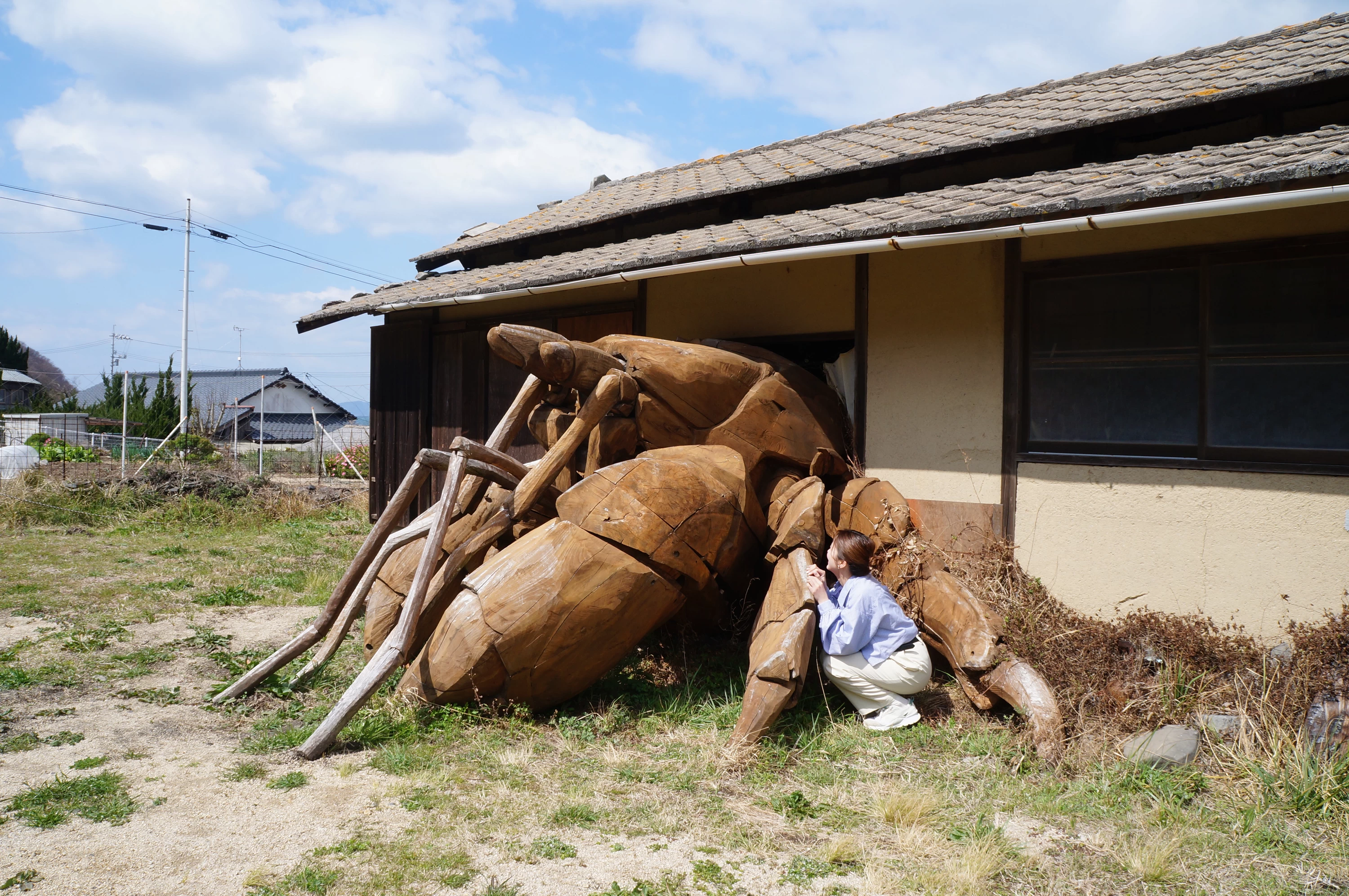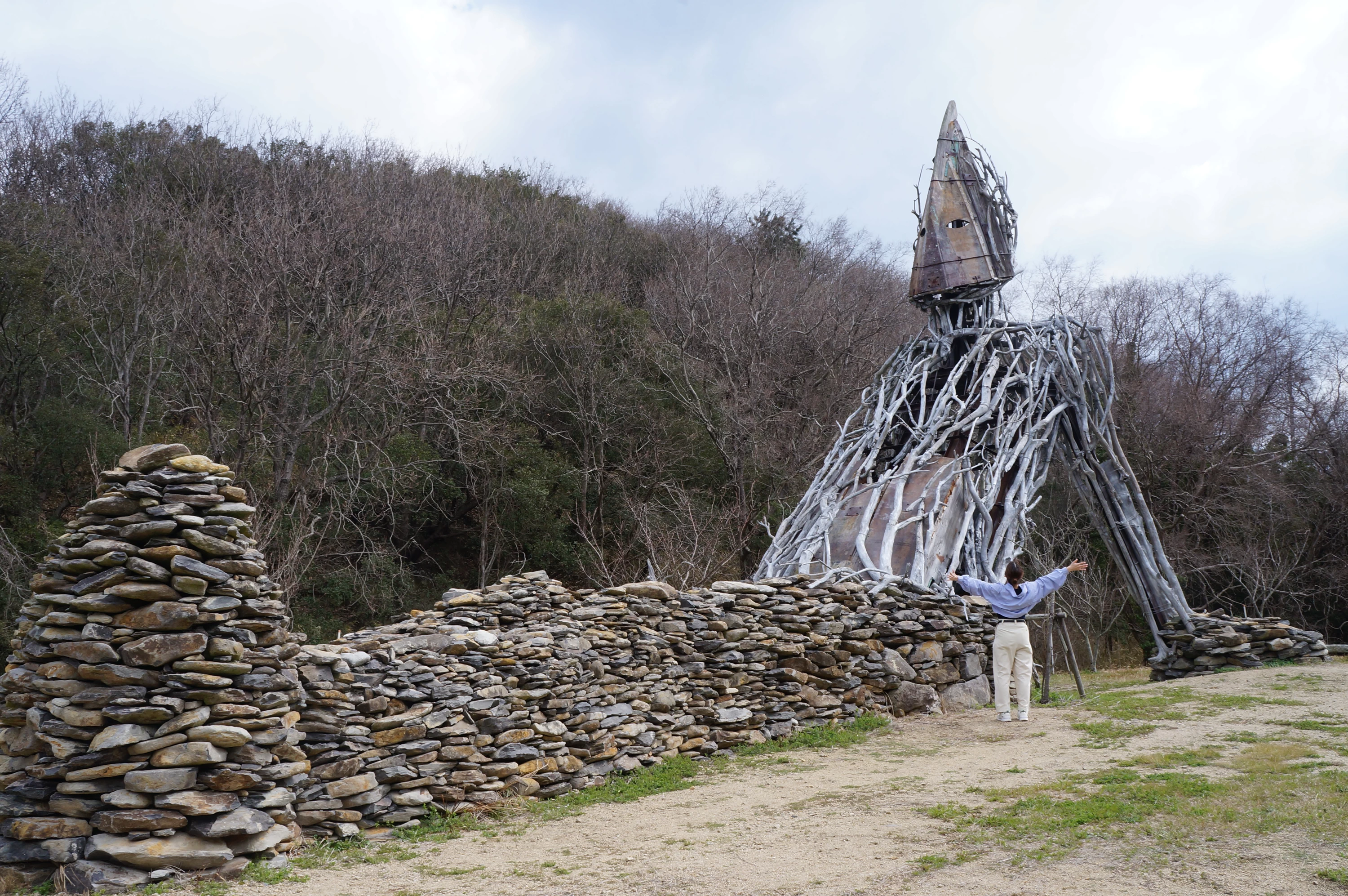 日本の山河を造ってきた巨人をモチーフにしていて、高さ9.5メートル、長さ17メートルもあり、とても大きく目立っている作品です。三都半島の神浦地区の小径の石垣や厳島神社に関連した廃船の他、瀬戸内海の各所で集めた流木を組み合わさっており、大宇宙や自然界と人間社会とをつなぐためのアイコンだそう。目の前に広がる瀬戸内海や神浦を高台から静かに見守っているかのように感じます。