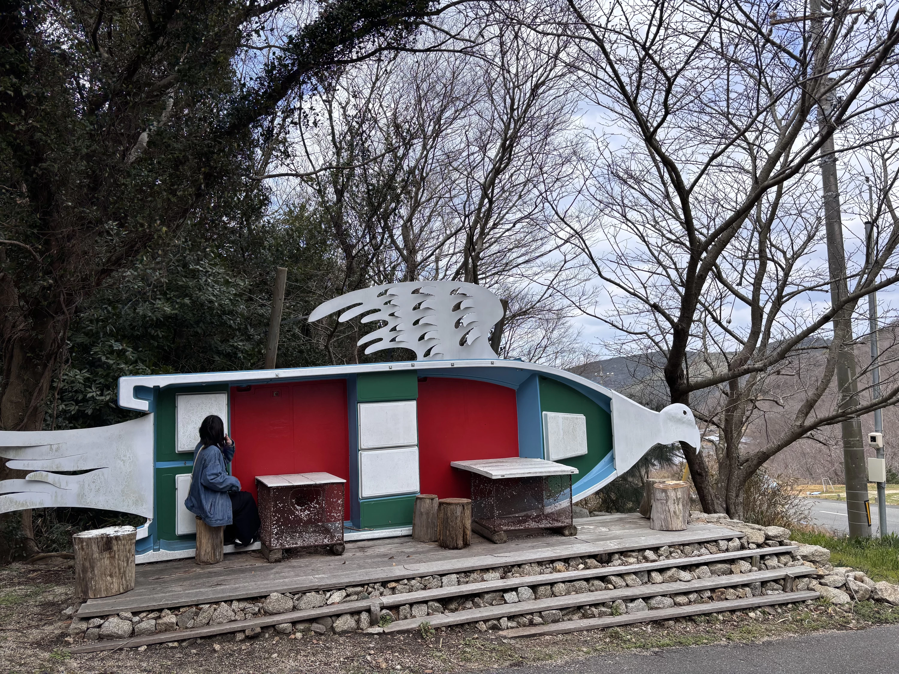 漁業者の高齢化によって使われなくなった舟を持ち主から譲り受け、作品化したです。丸太や流木、漁具などを使って椅子やテーブルが設えられおり、海での役目を終えた舟で蘇る様を表しているそう。白い鳥が羽ばたいている様子は、カタチを変えて新たな再出発を表しているようでした。