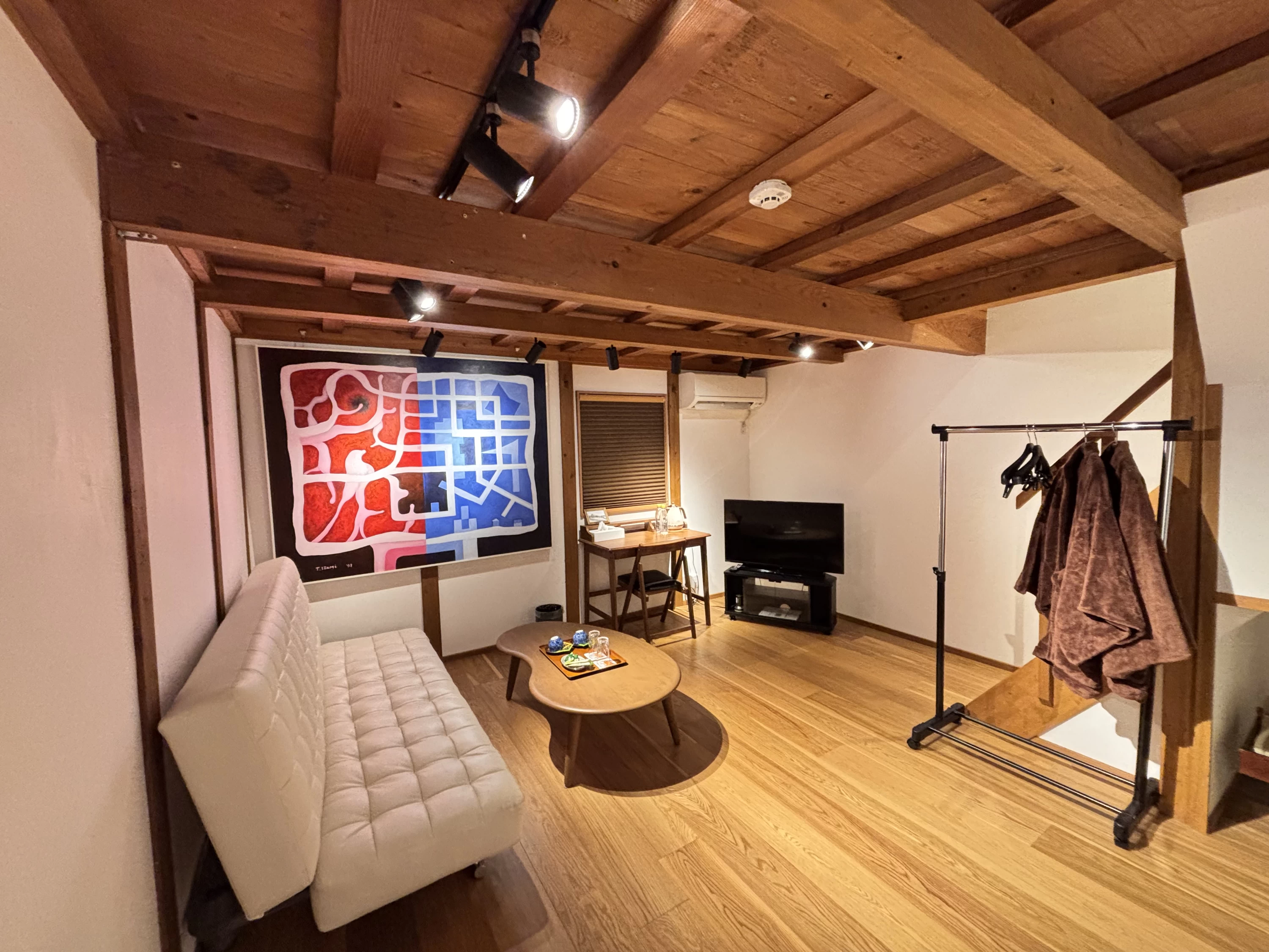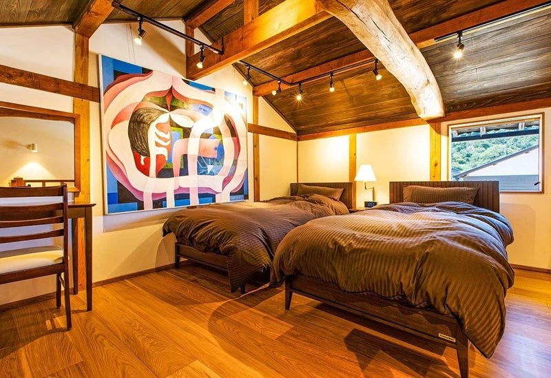今回宿泊したのは、ロフト付きの洋室「ギャラリー」。温かみのある落ち着いた雰囲気で、古民家ならではの梁が生かされたレトロモダンな空間。ロフトの階段を上るとツインベッドがあります。ゆったり広々使って、翌日の旅の備えることができました。