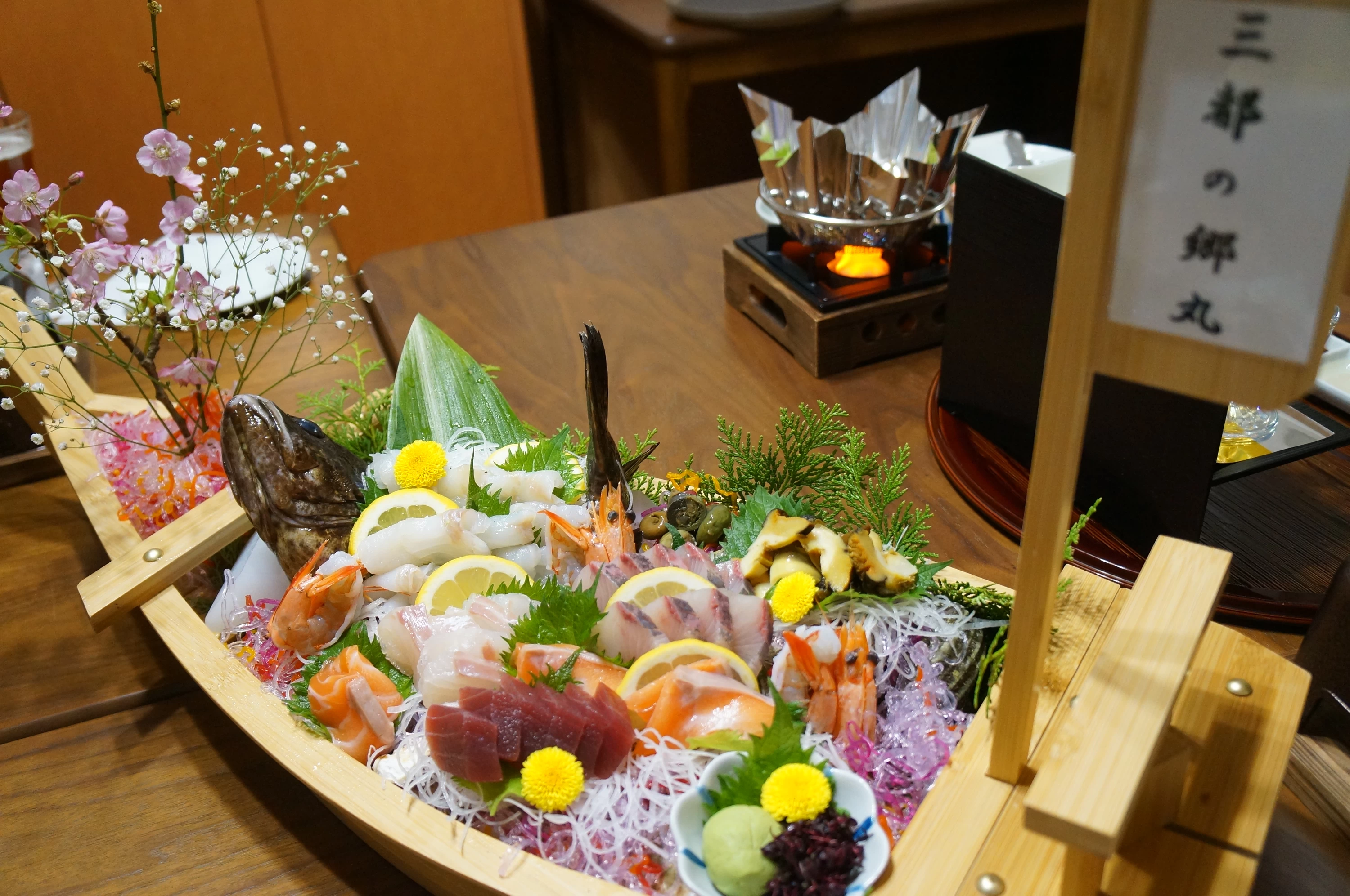 小豆島産の鮮魚の舟盛! 小豆島の地元で獲れた鮮魚が豪華に盛り付けられていて、視覚からも食事を楽しむことができます。新鮮な刺身は、口に入れた瞬間に旨味が広がりました。特においしかったのが「タケノコメバル」。淡白でさっぱりとした味わいです。