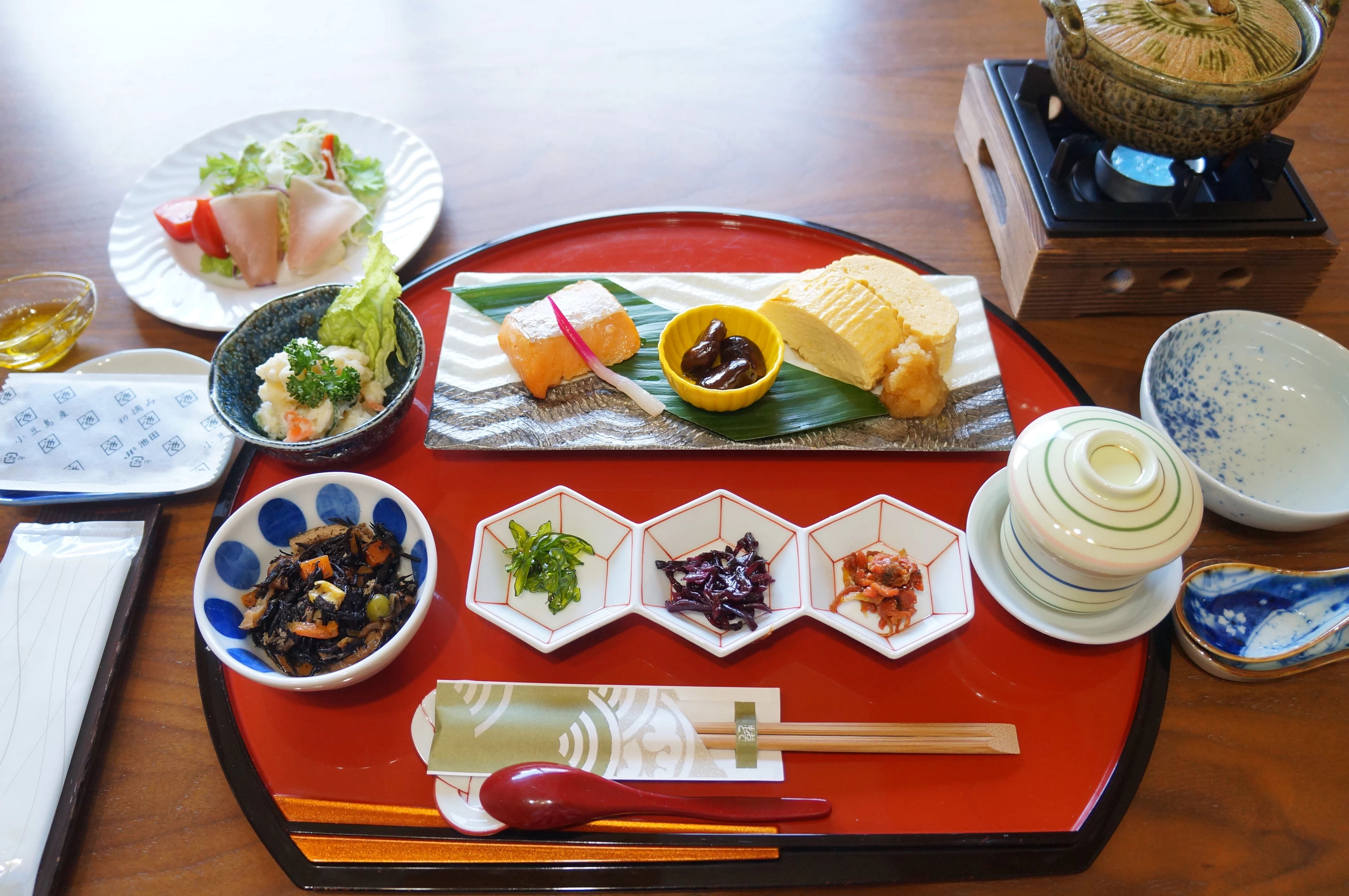 朝食は、計9品のボリューム満点、和食定食。オリーブオイルをかけて食べるサラダ、卵焼き、茶碗蒸し、焼き魚のほか、ひじきの煮物や佃煮などの白米が進むおかずが揃います。醤油造りが盛んな小豆島では、佃煮造りも600年以上の伝統があり、無添加で体に優しい。白ご飯もおかわり自由なので、おかずだけ余っちゃった・・・!ということがなく、心ゆくまで楽しめます。小豆島内の店で作られたものが並んでいるので、気になるおかずがあれば、スタッフさんに聞いてみるとお土産として持って帰れるかも。
