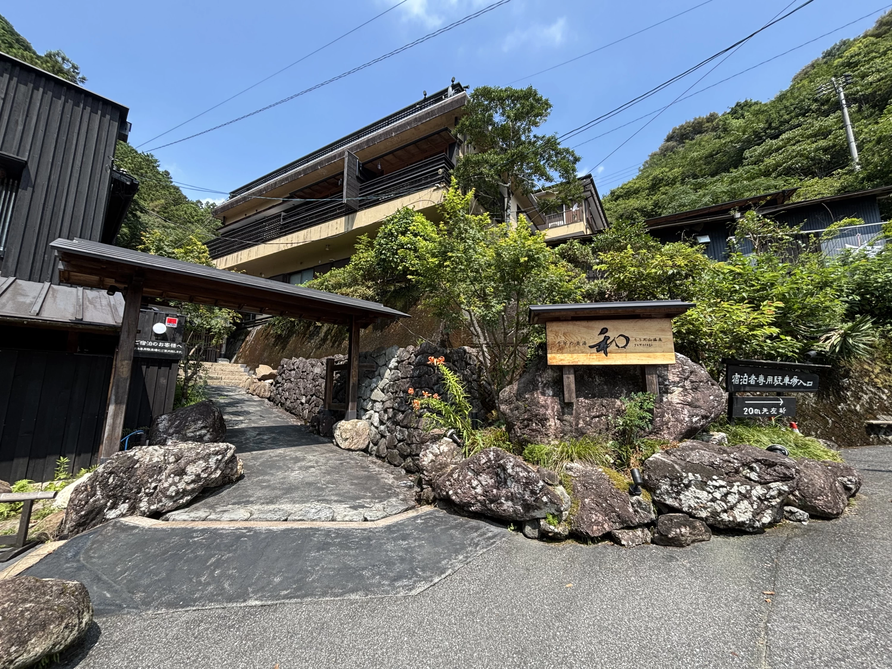 道を進んでいくと、まるで自然の中に隠れるように佇む「そうだ山温泉 和」が姿を現しました。