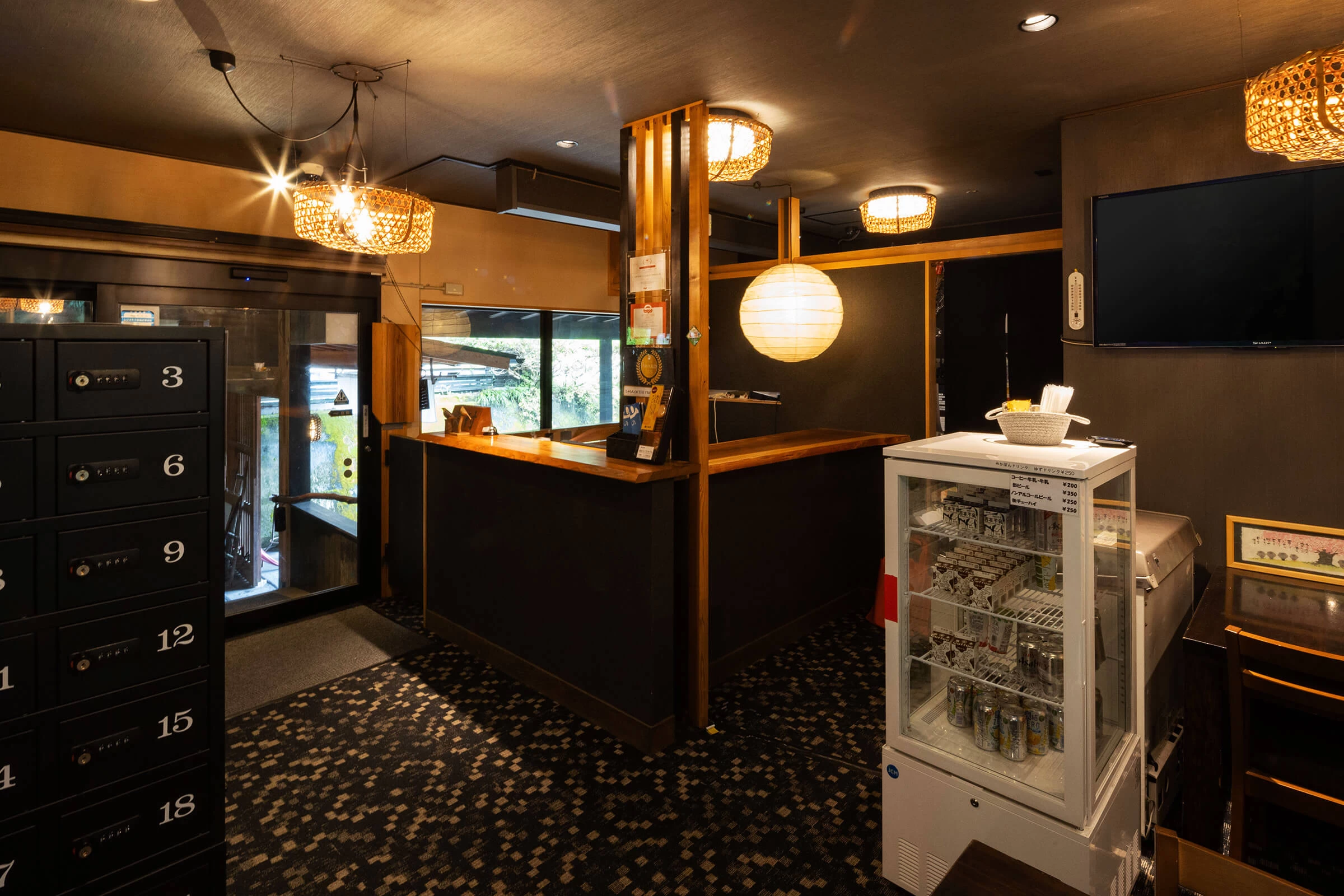 チェックインする本館内は、外観と同様に黒を基調とした和モダンな空間で、飲料の販売や入浴券売機がありました。