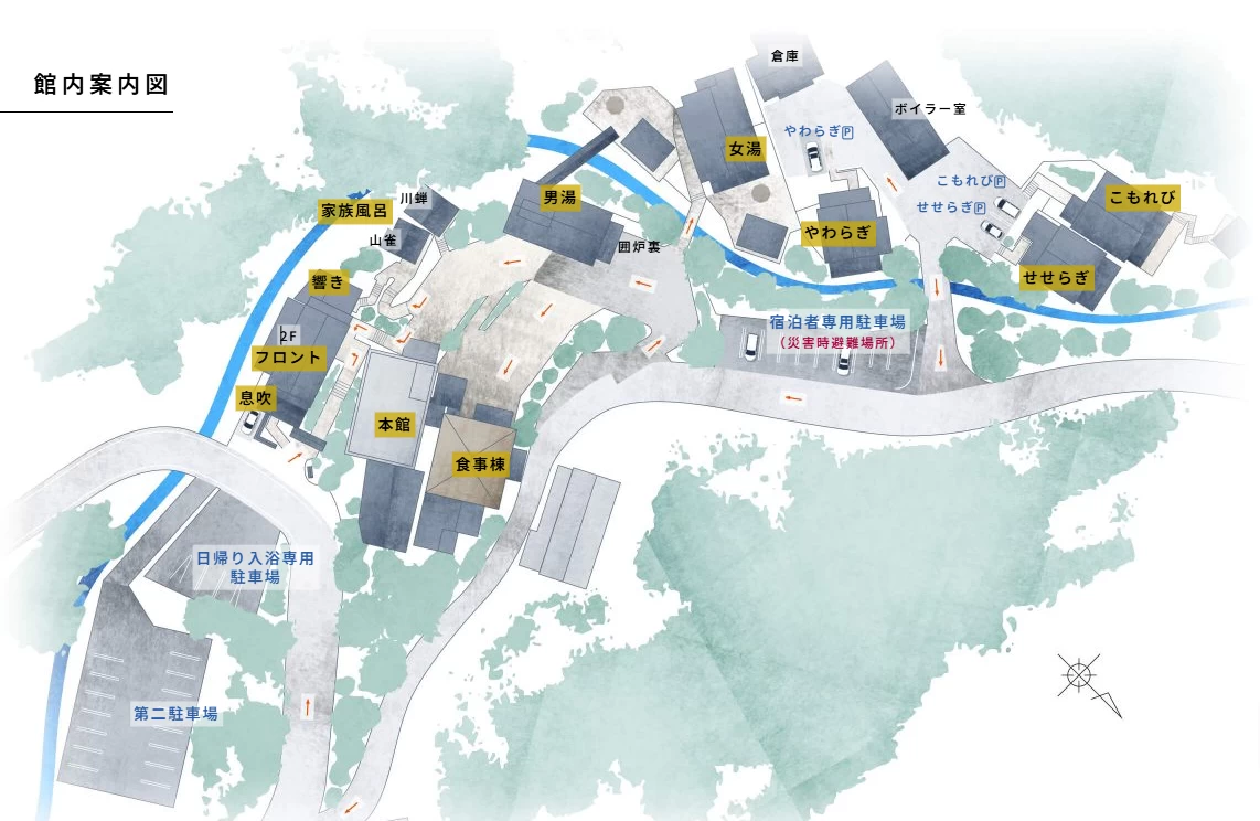 また、敷地内には、木々に包まれるようにして、本館と5つの離れ宿、男女別の大浴場が点在しています。