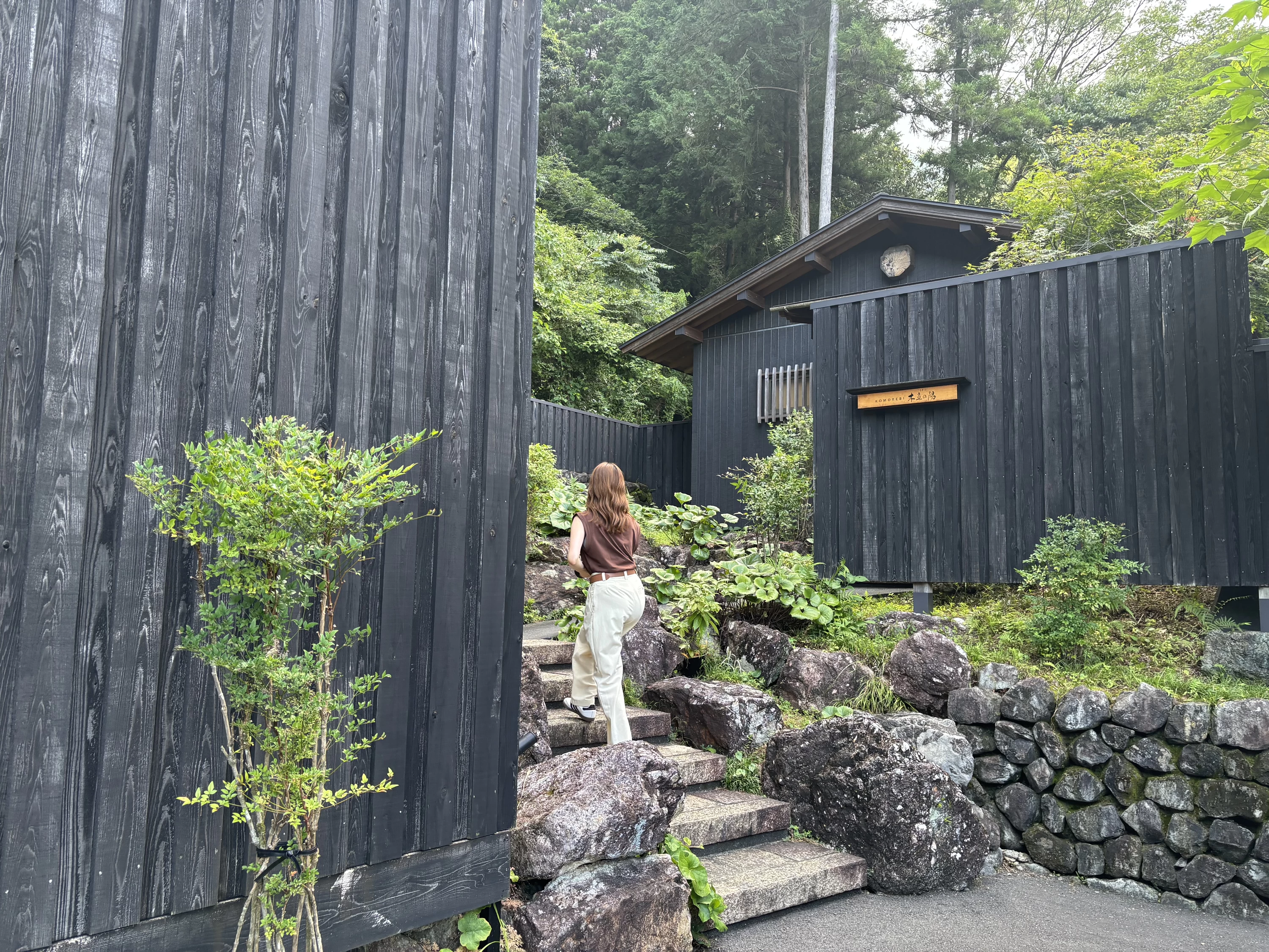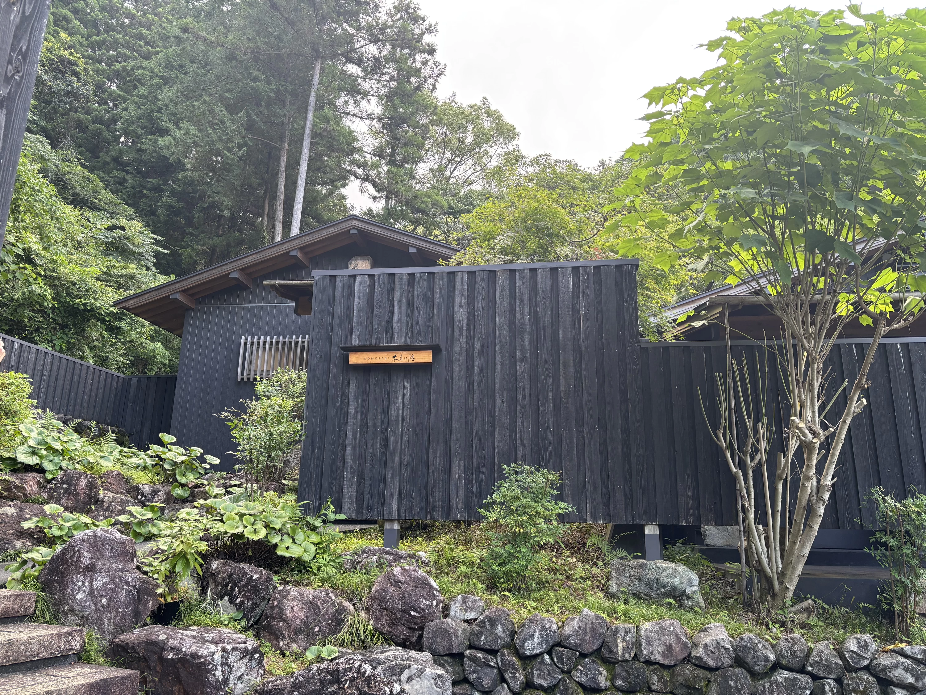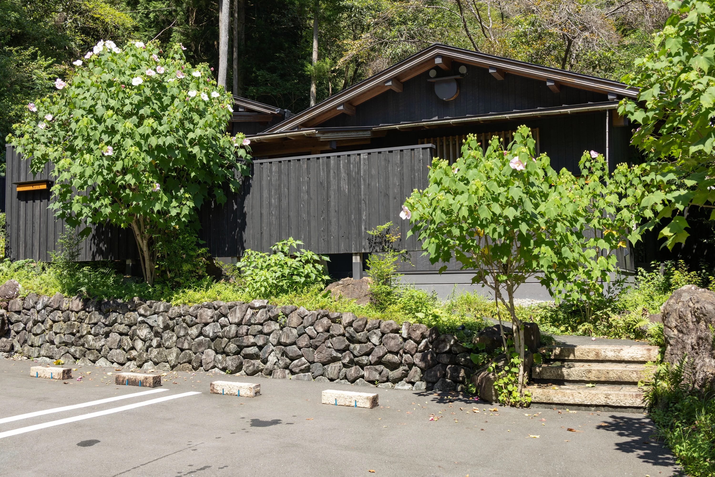 黒い木目の落ち着いた外観で、周囲の緑と自然に溶け込むように佇んでいます。