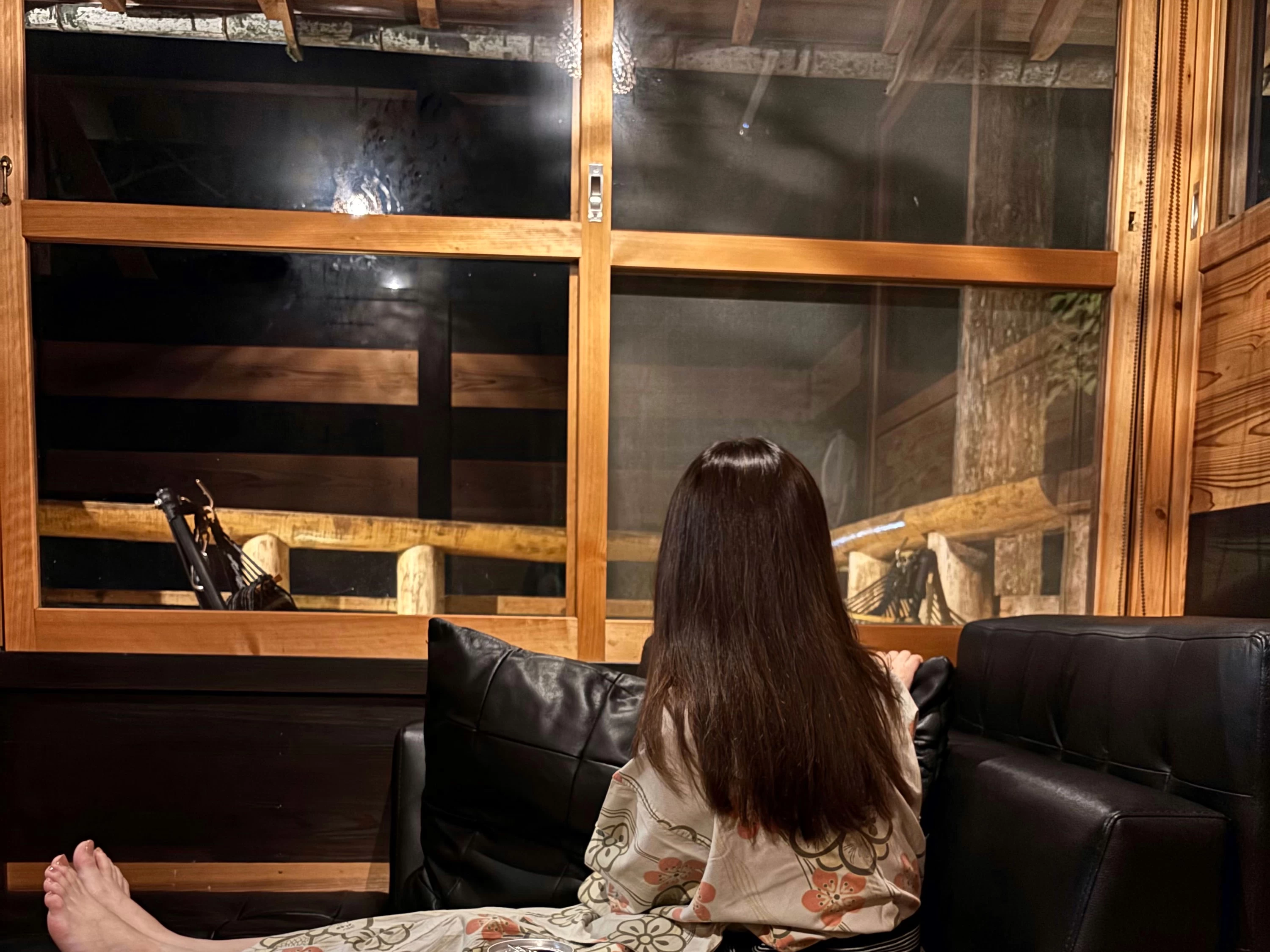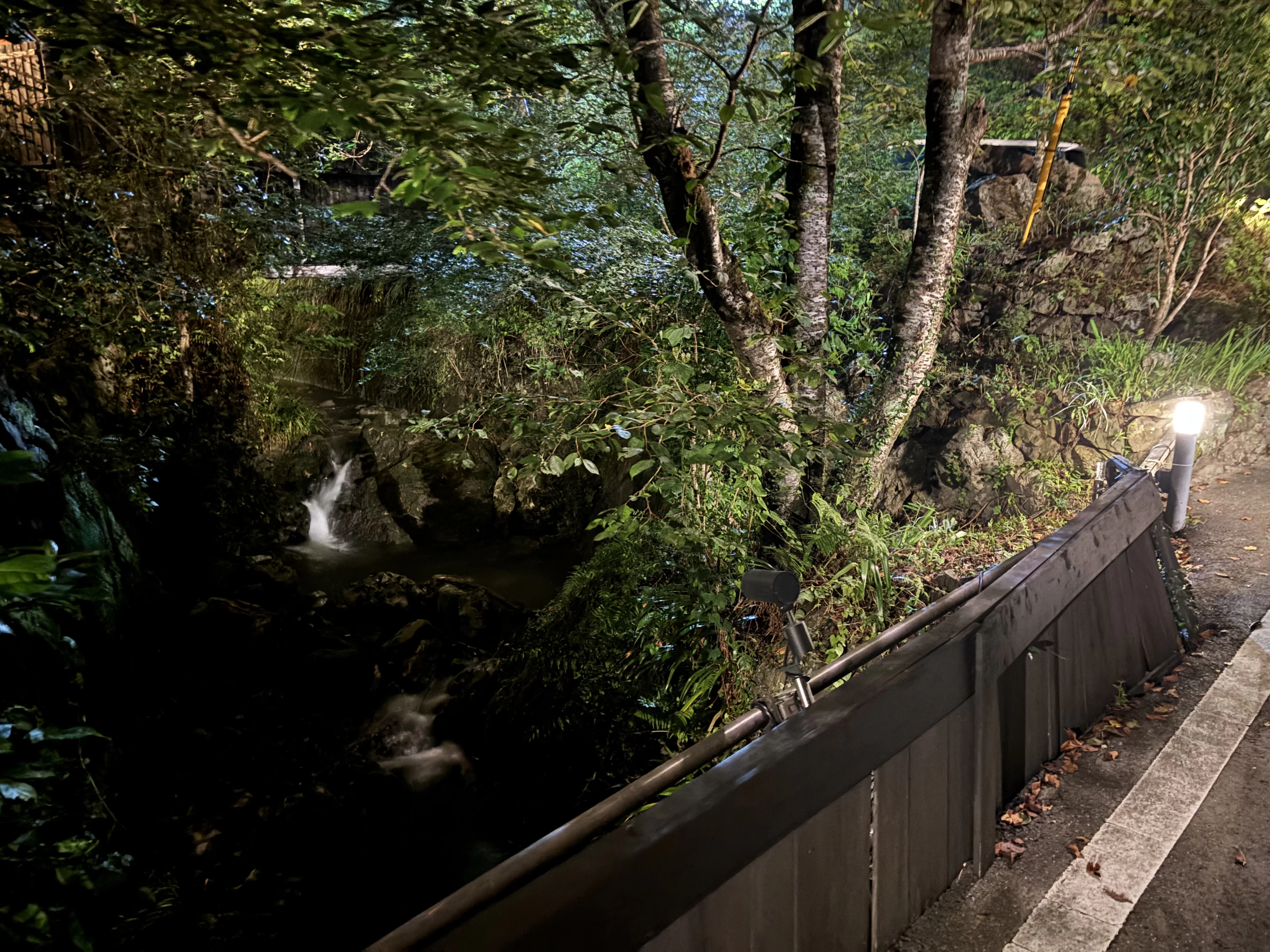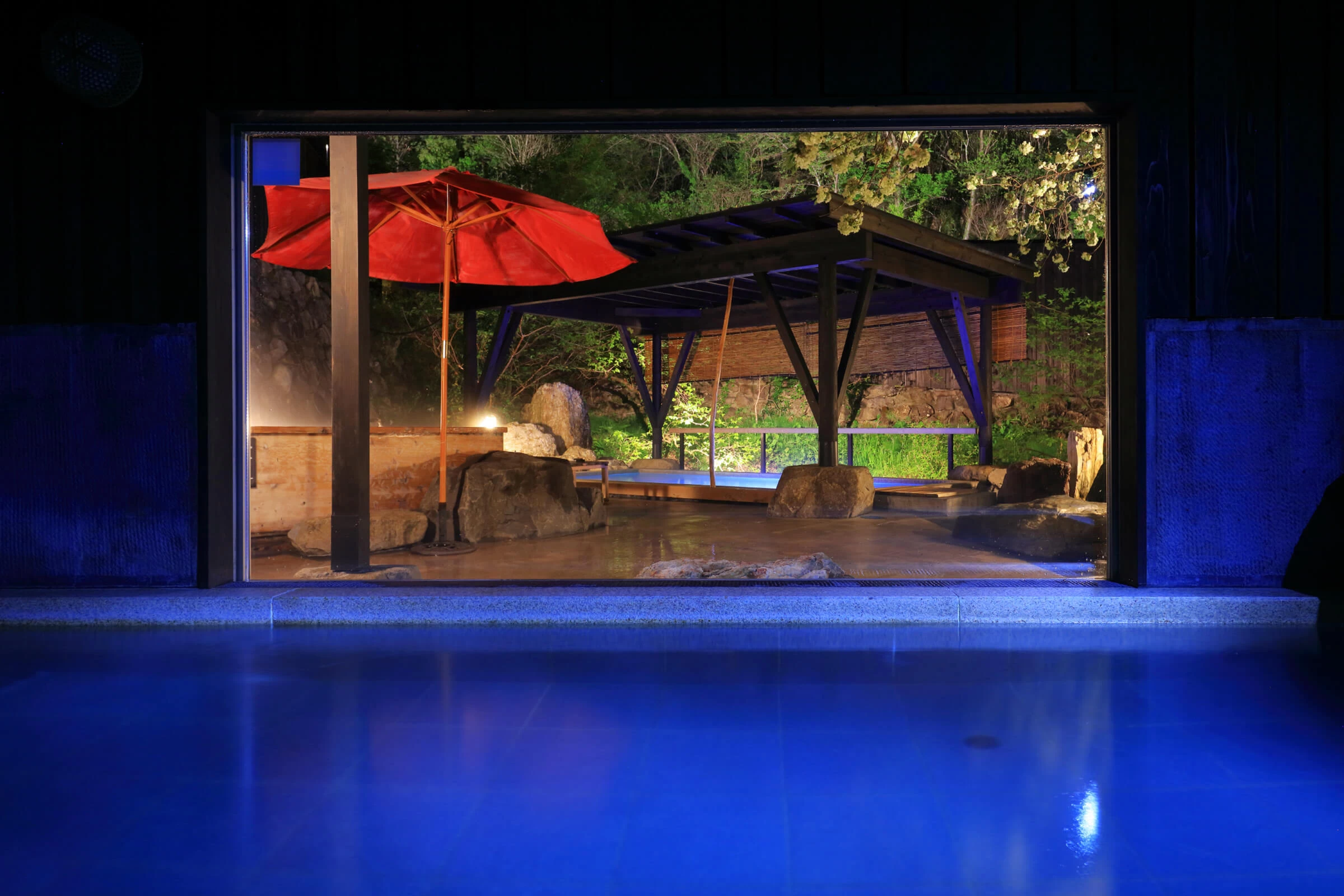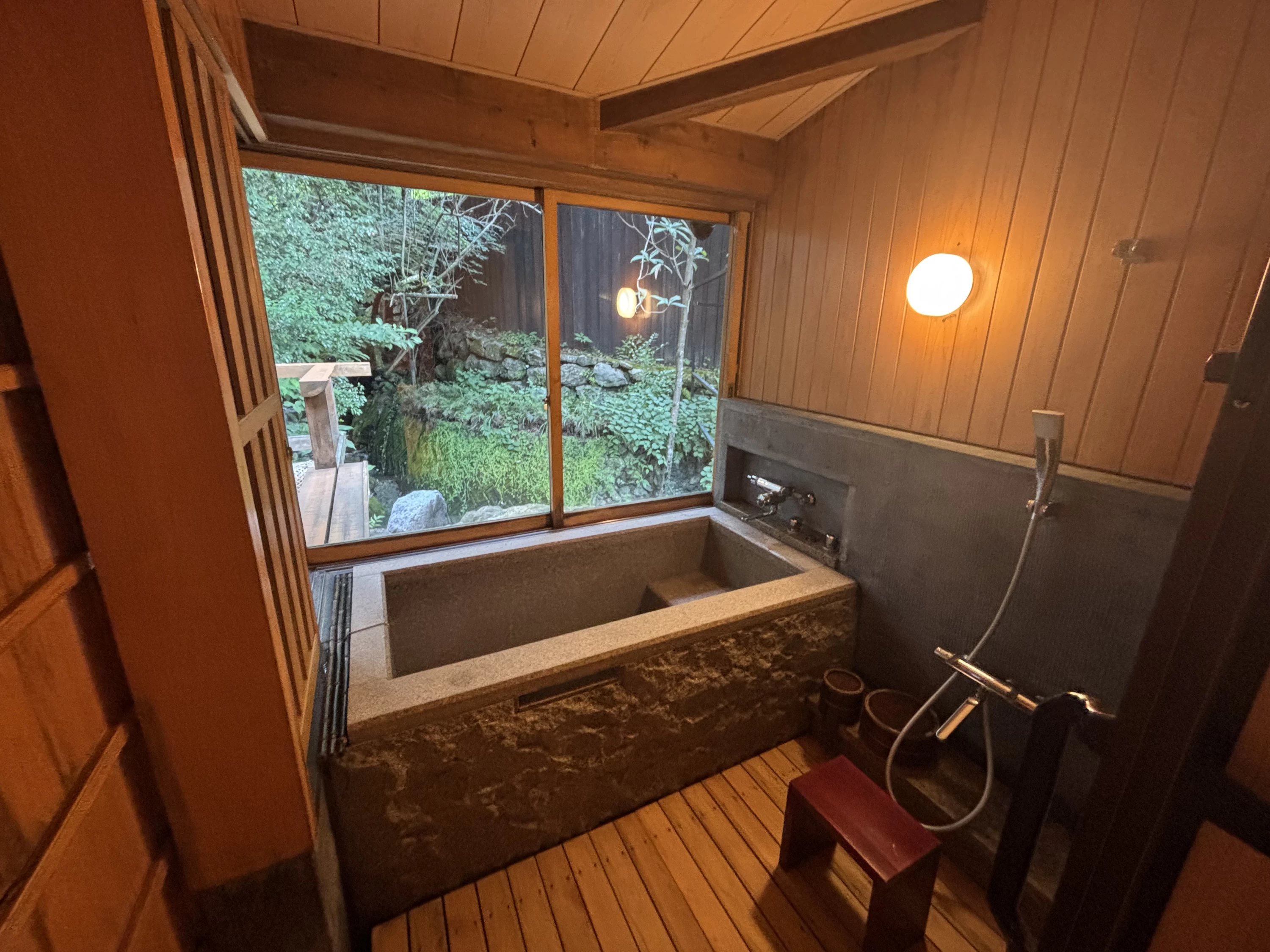 続いて、いよいよ露天風呂へ。広々とした開放的な湯船の目の前には、山の木々がそびえ、眼下には小川が流れます。暖かなライトに照らされた木々と湯面が揺れ、自然の音に包まれる空間の中、今日の旅路をぽつぽつと語り合う時間・・・。まさに非日常の贅沢なひとときでした。