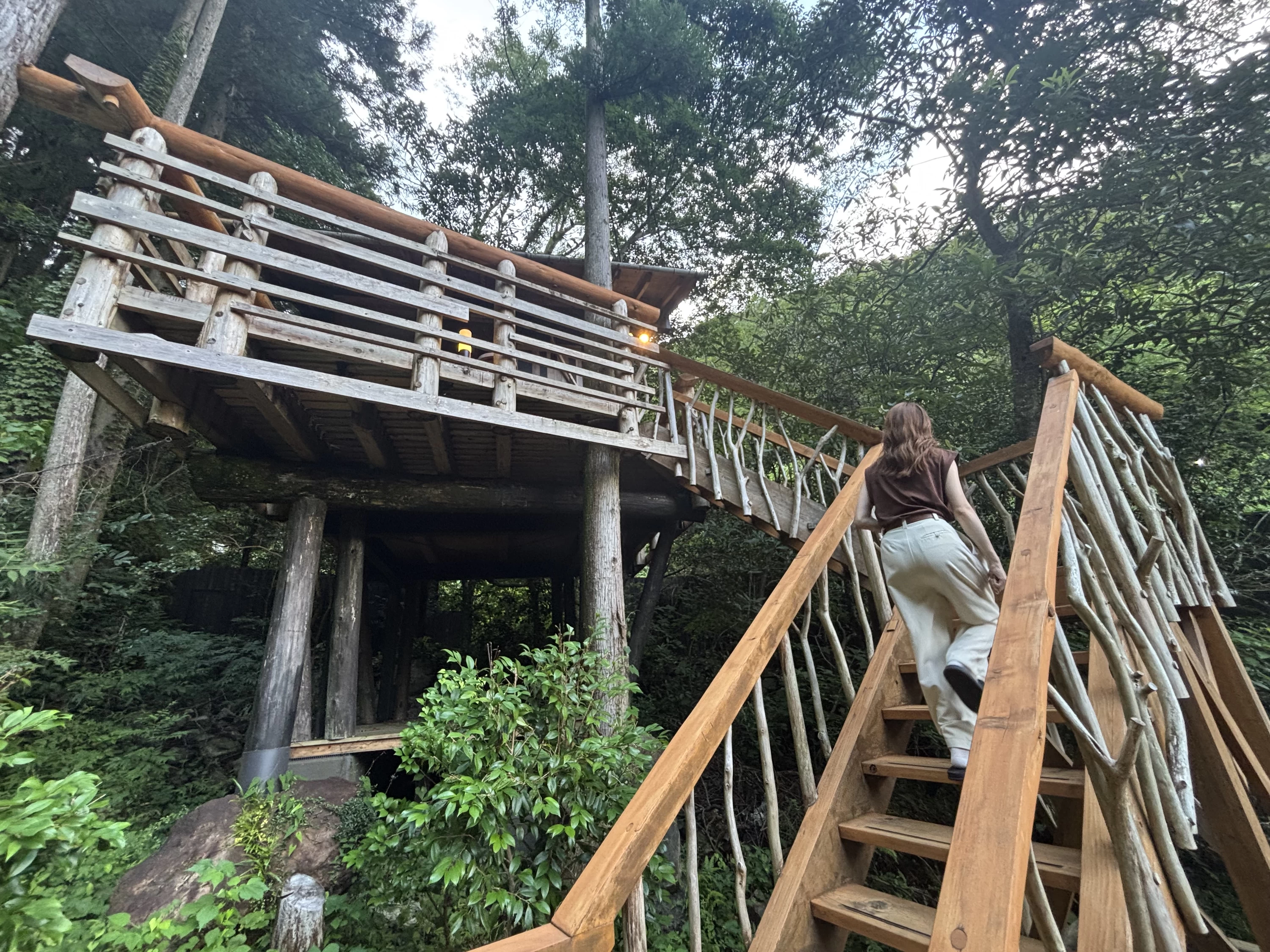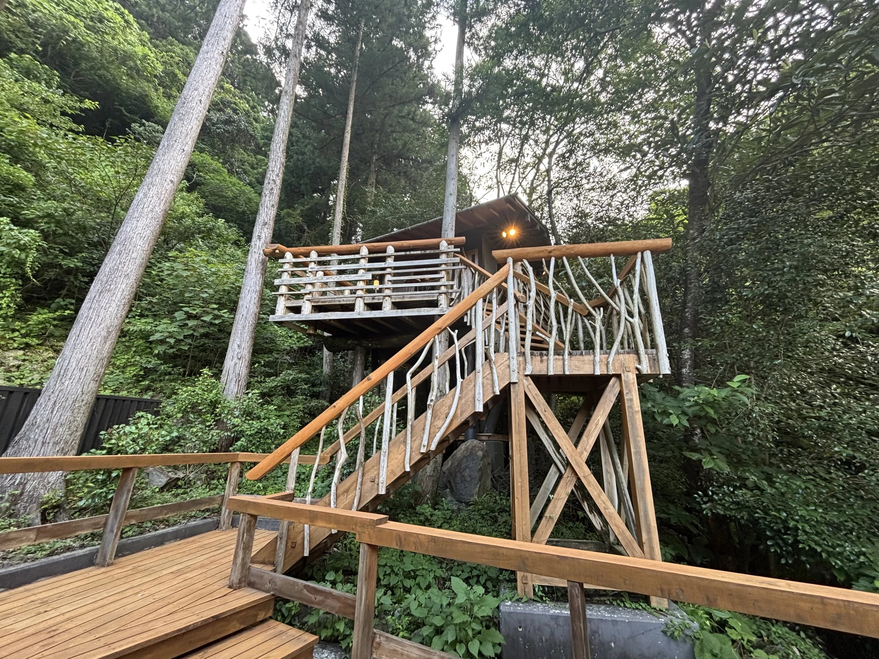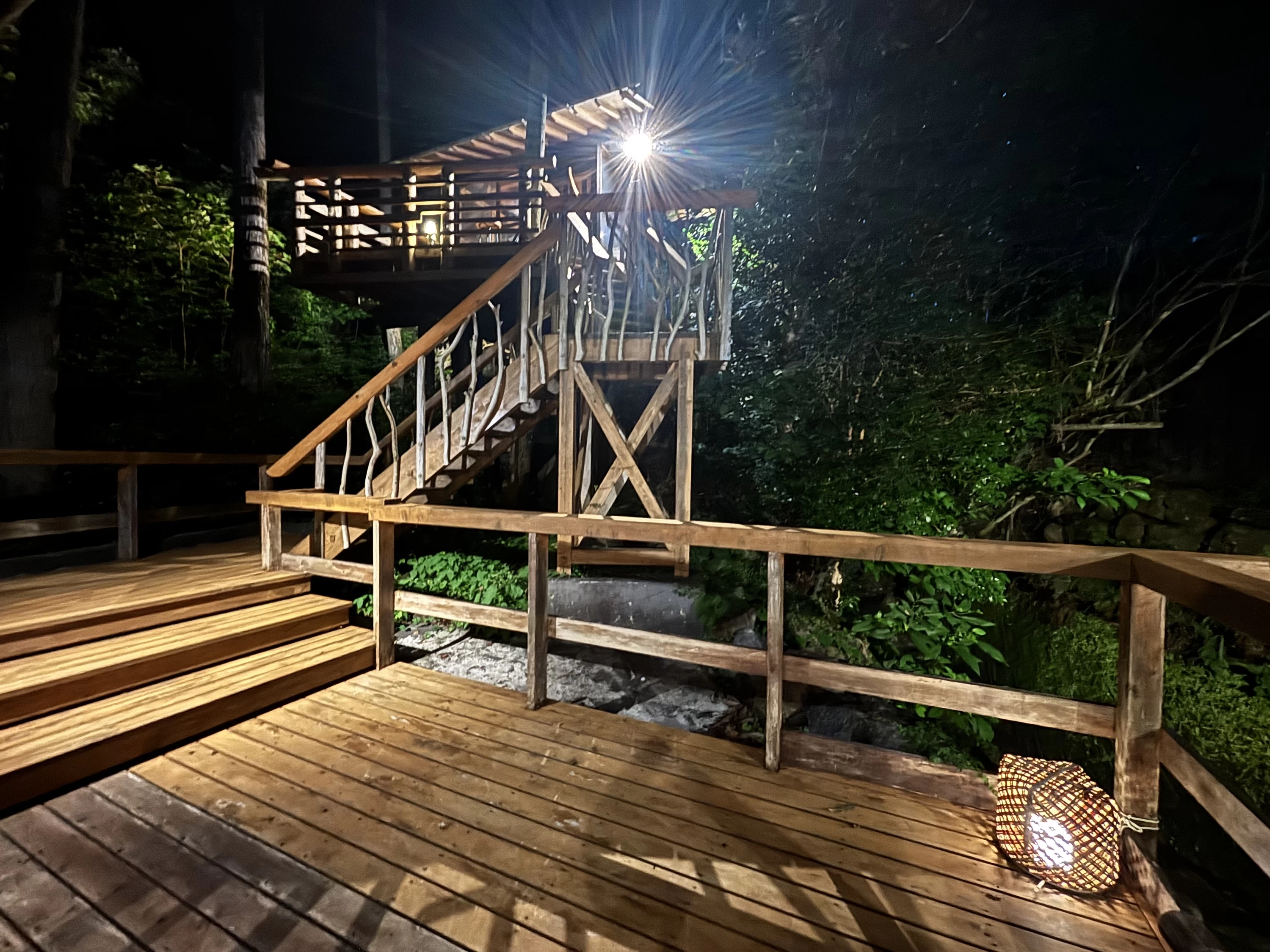 お風呂でほくほくになった私たちは、外の空気に誘われて、夜のツリーハウスへ。