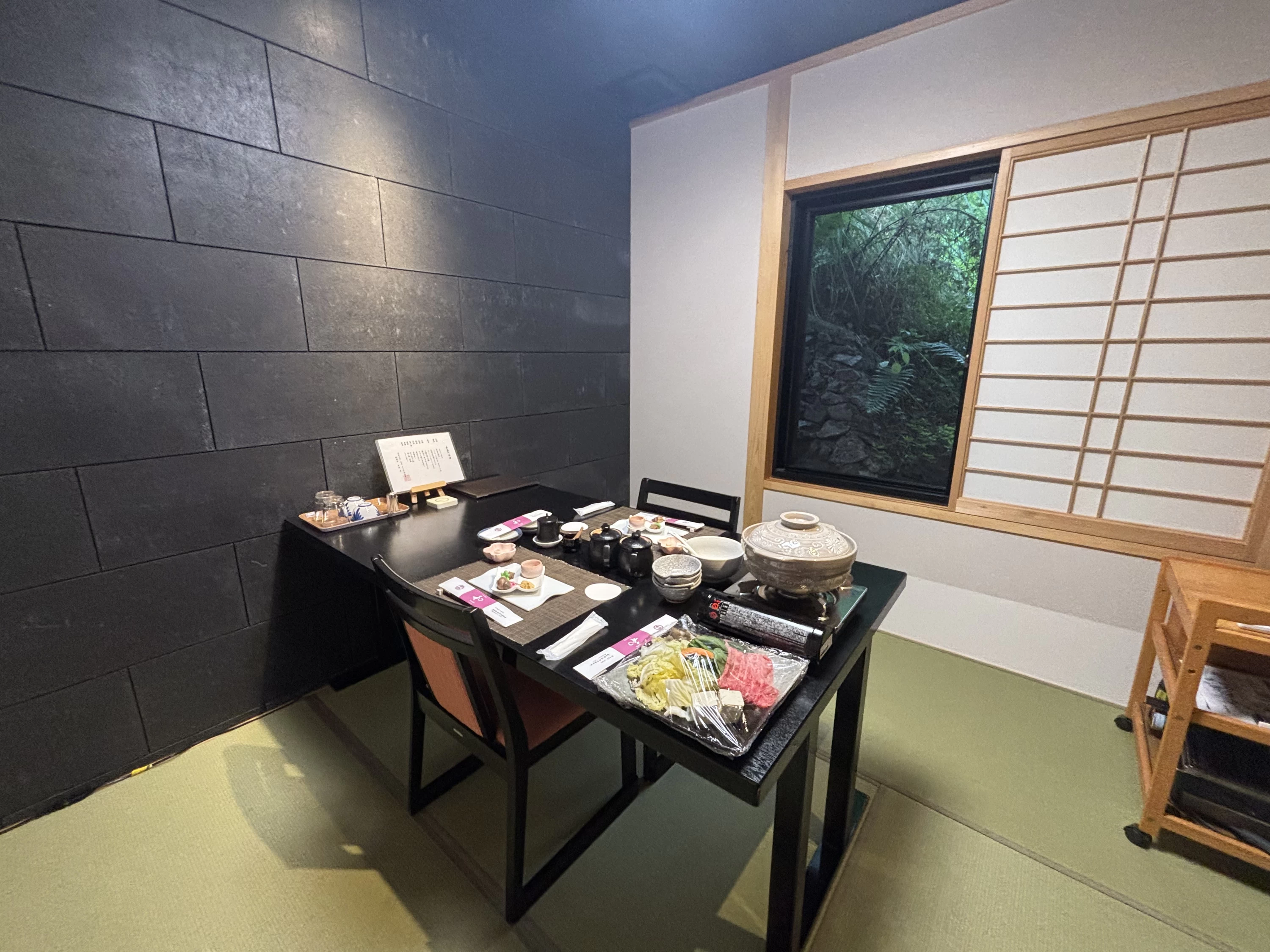 案内されたお部屋に入ると、テーブルの上にはすでに先付・前菜・鍋のセットが美しくセッティングされていて、一気に食事への期待が高まります。