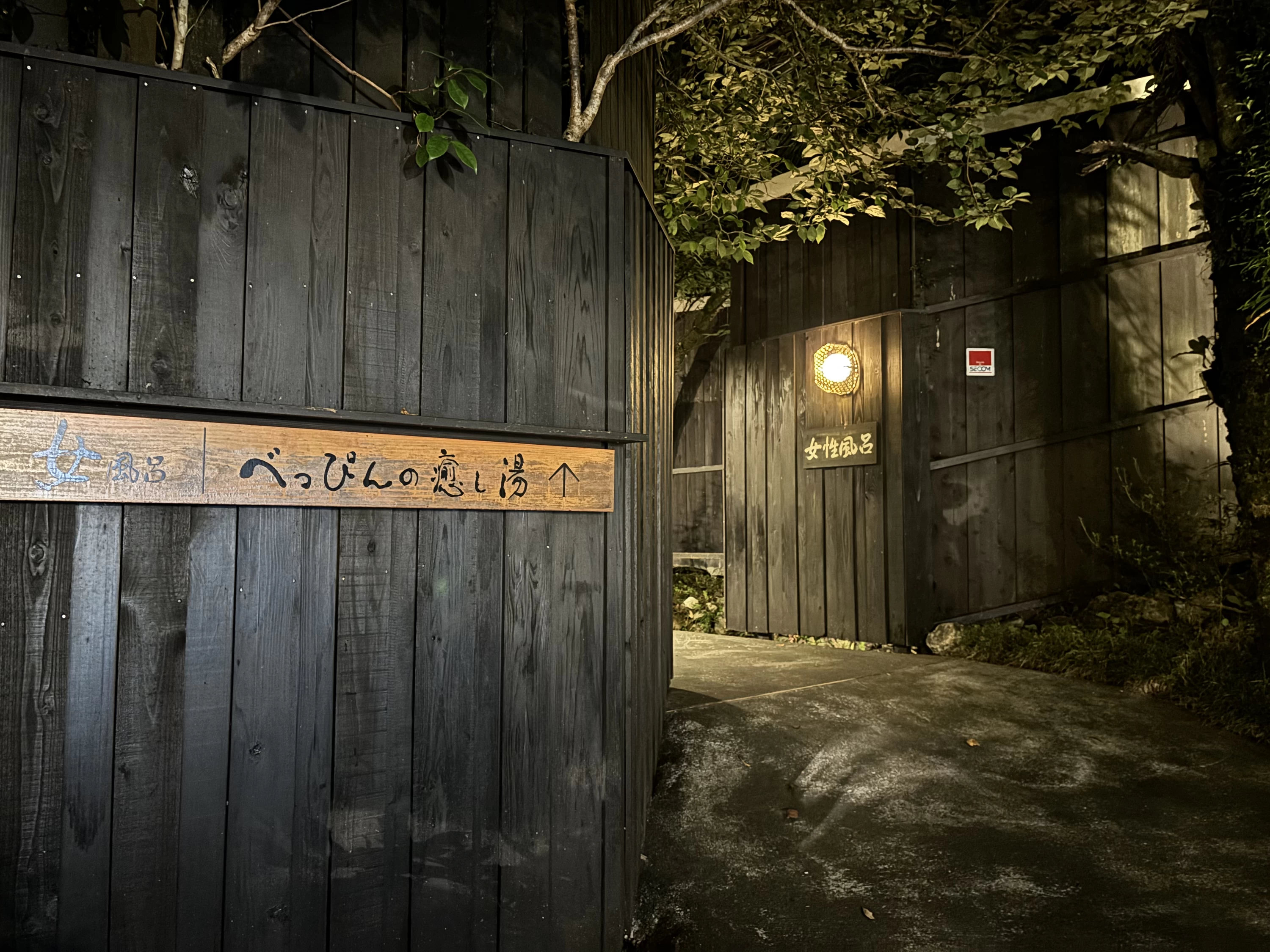 大浴場へ向かう道すがら、小川のせせらぎや虫の声が耳に届き、ライトアップされた木々の灯りが優しく夜道を照らします。
